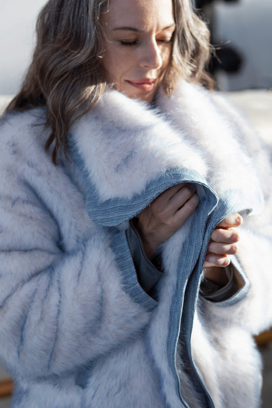 Eisblauer Kunstpelzmantel mit Farbverlauf und Jeansbesatz