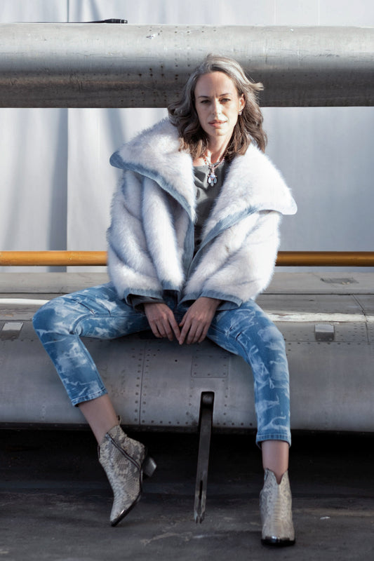 Elfenbeinfarbener Kunstpelzmantel mit Grauverlauf und Denim-Besatz