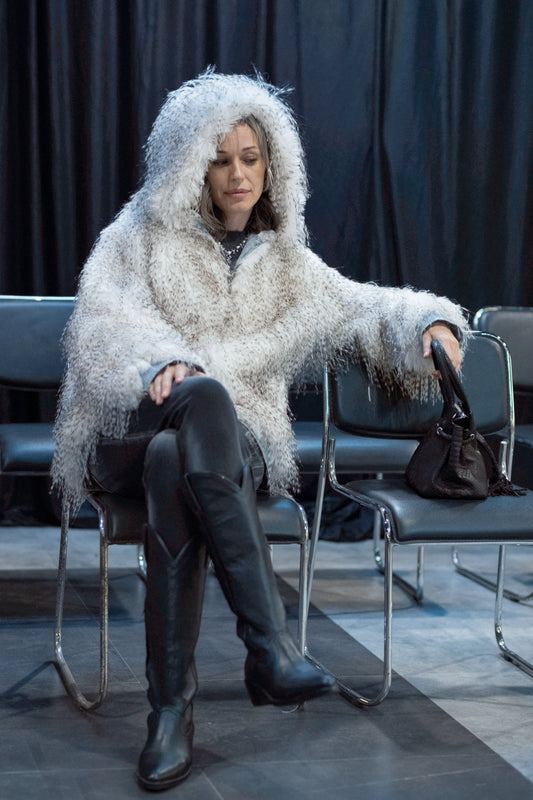 Weiß-grauer Kunstpelzmantel mit Farbverlauf und Kapuze und Jeansbesatz