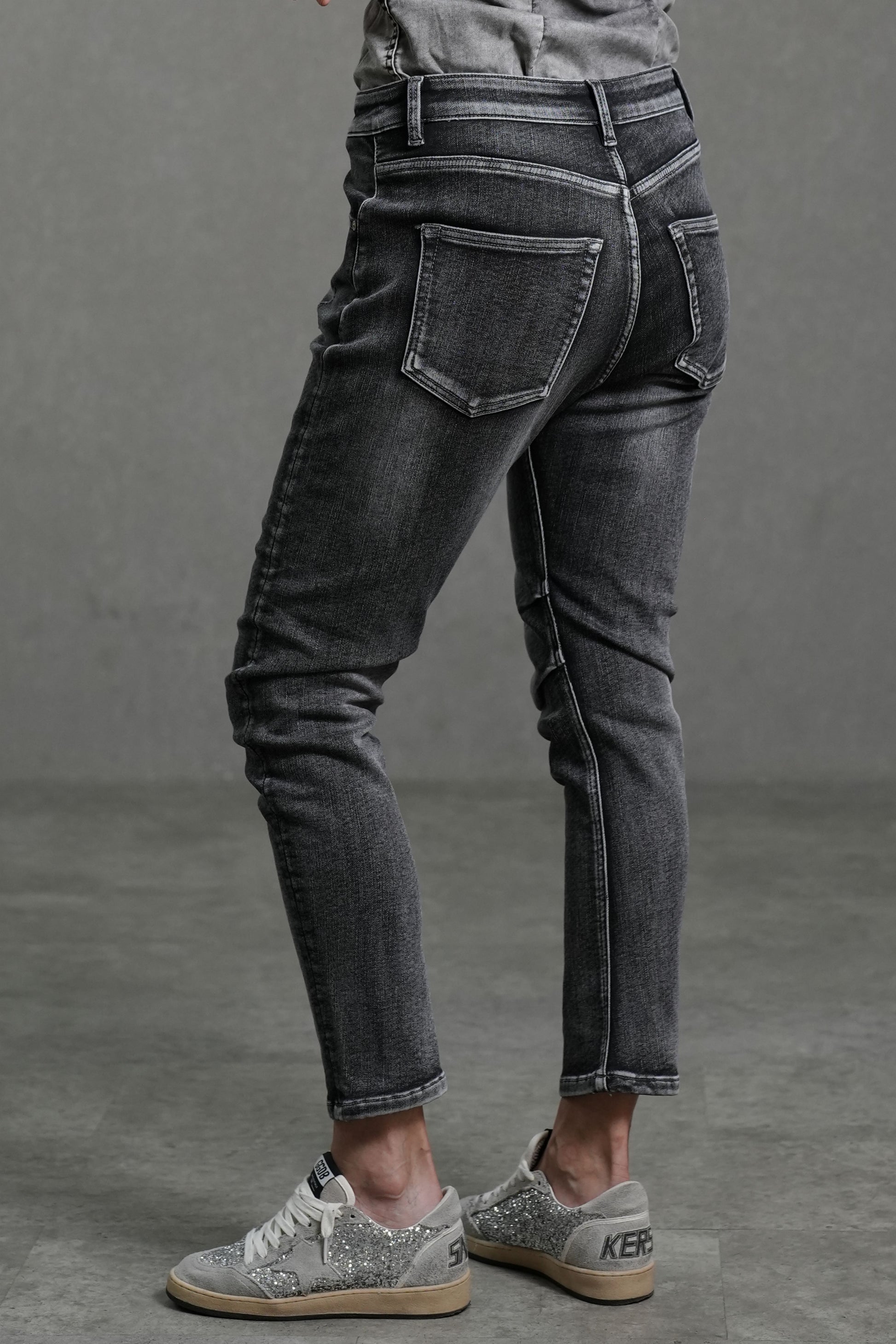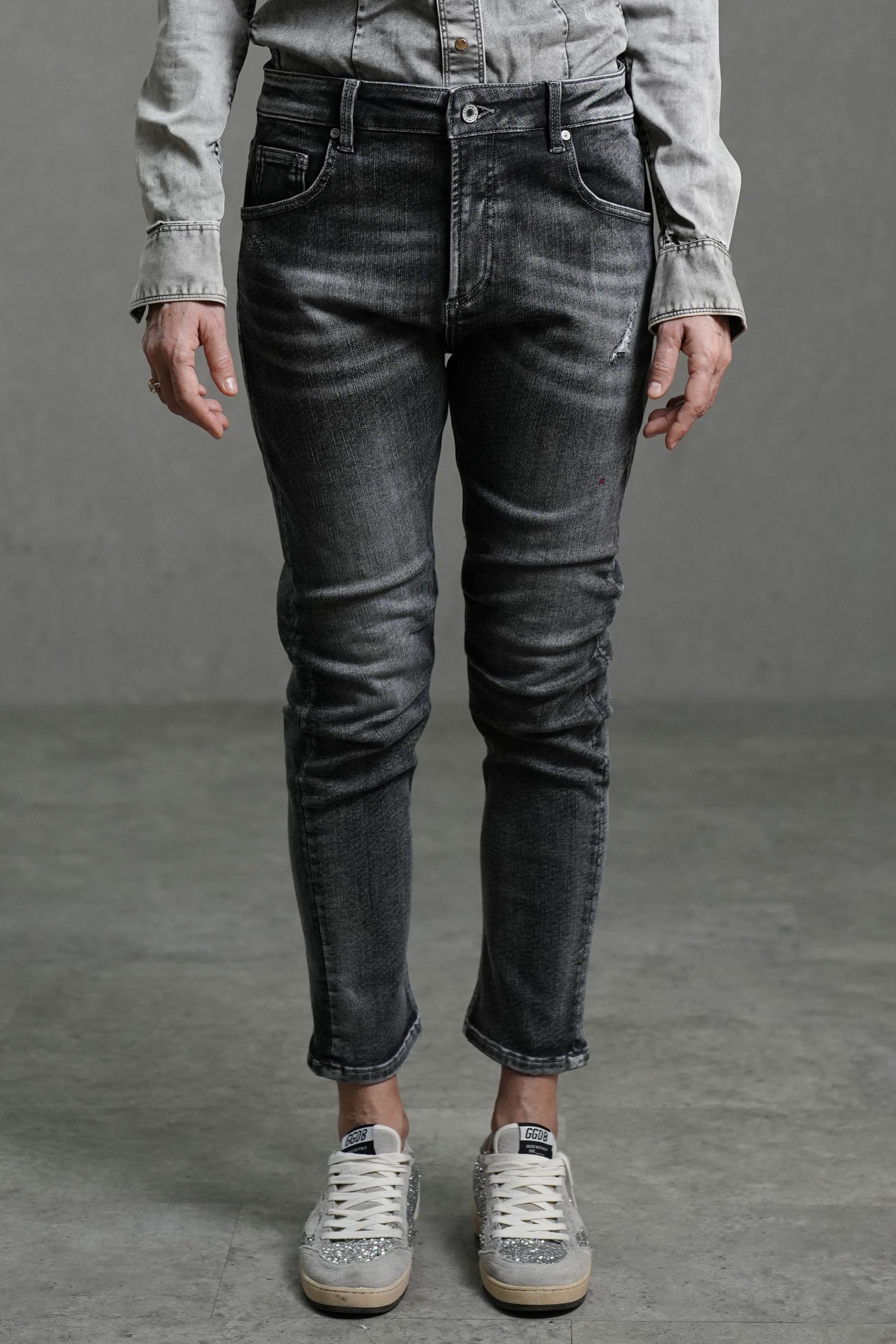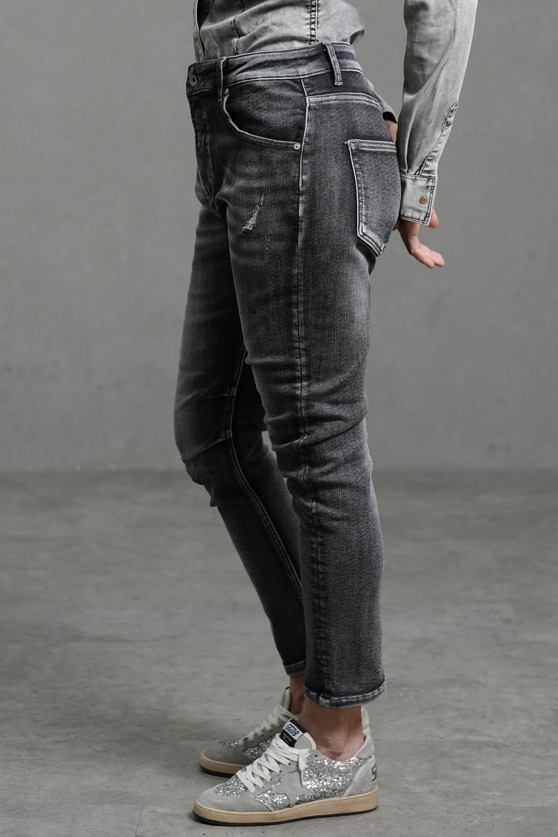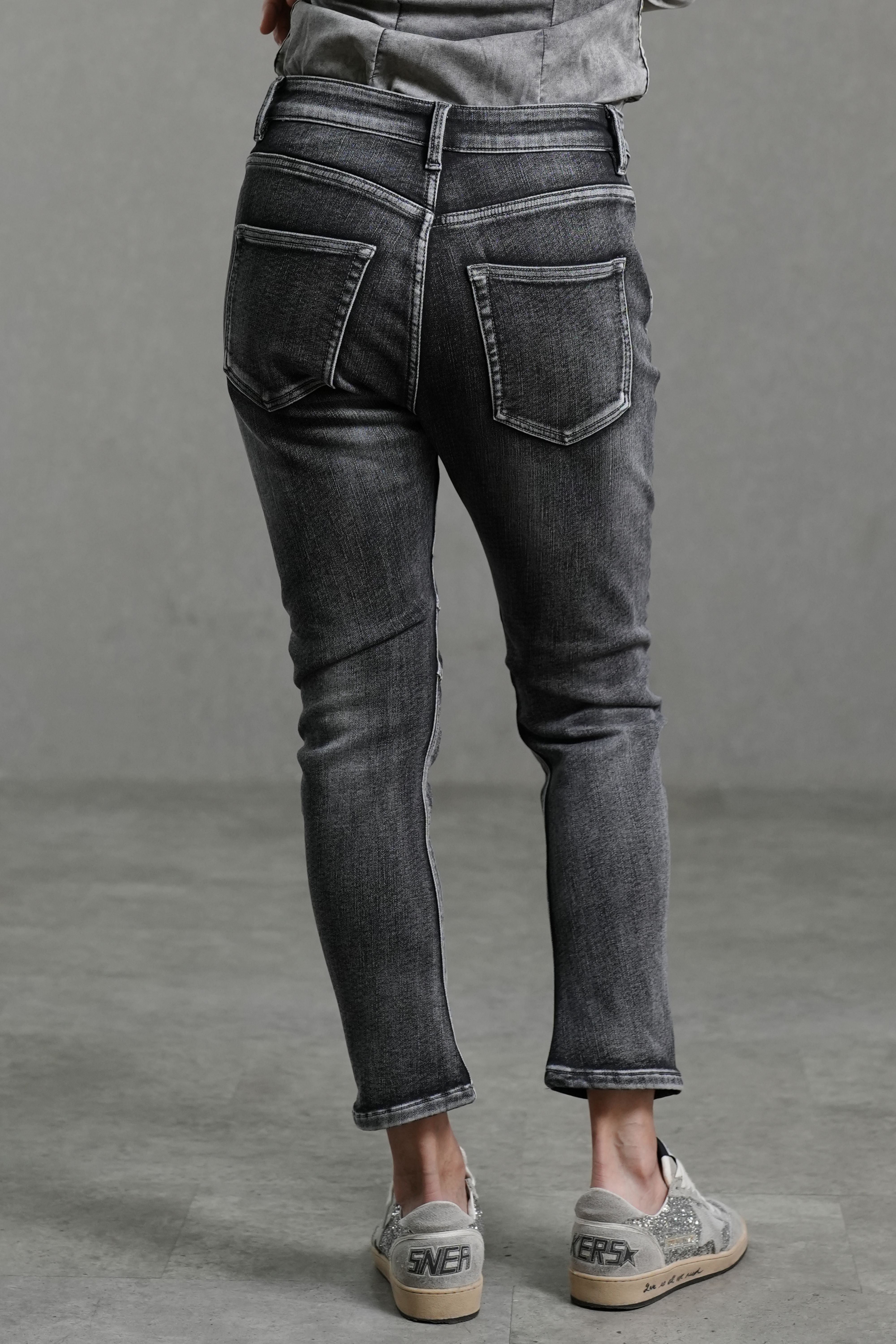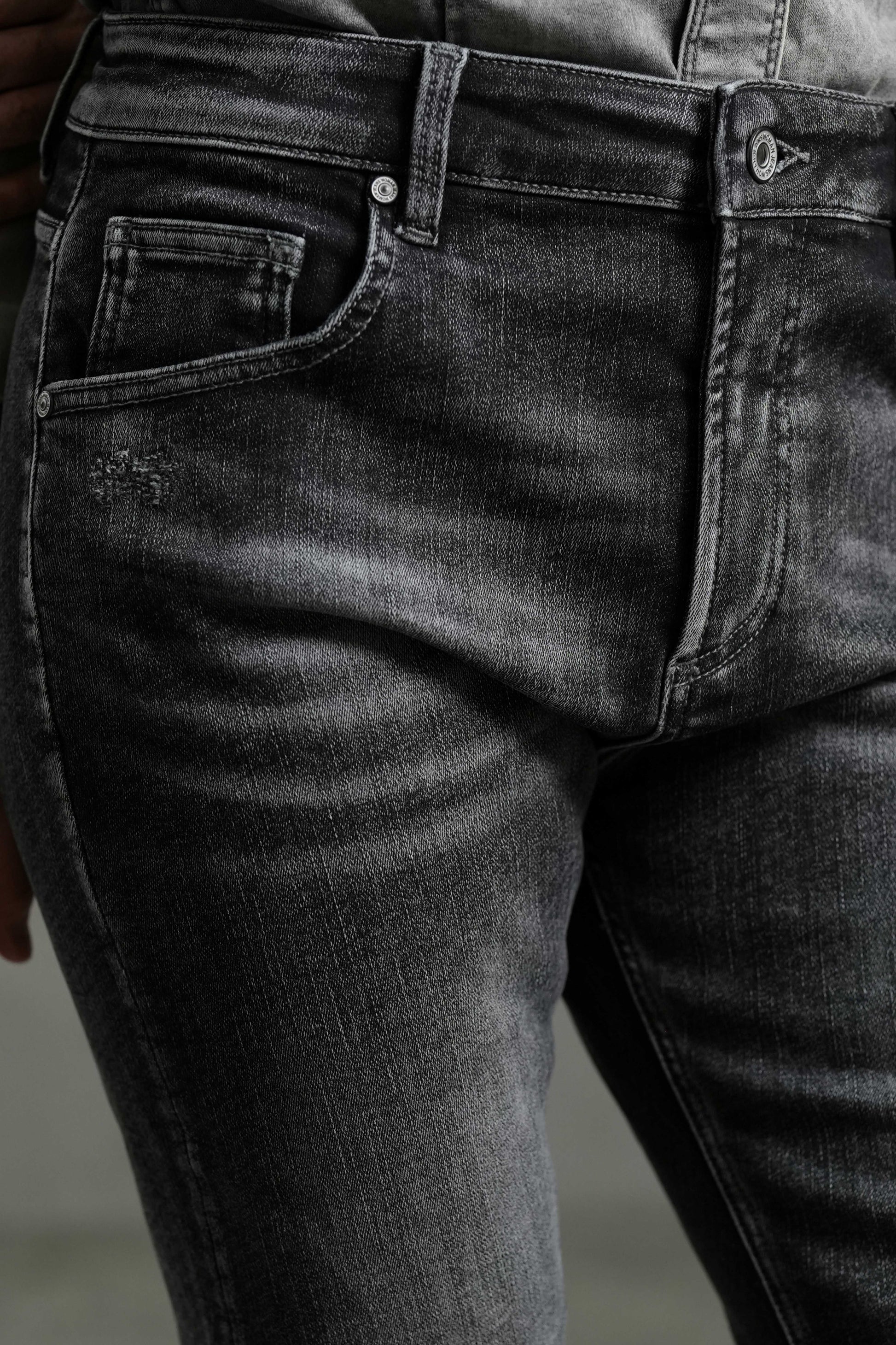 Confectionné dans un denim doux et très stretch, ce jean épouse la silhouette pour une ligne fluide et sculptée. Le délavage noir subtilement estompé ajoute de la profondeur et une touche de modernité, idéale aussi bien pour un look décontracté que plus habillé.
