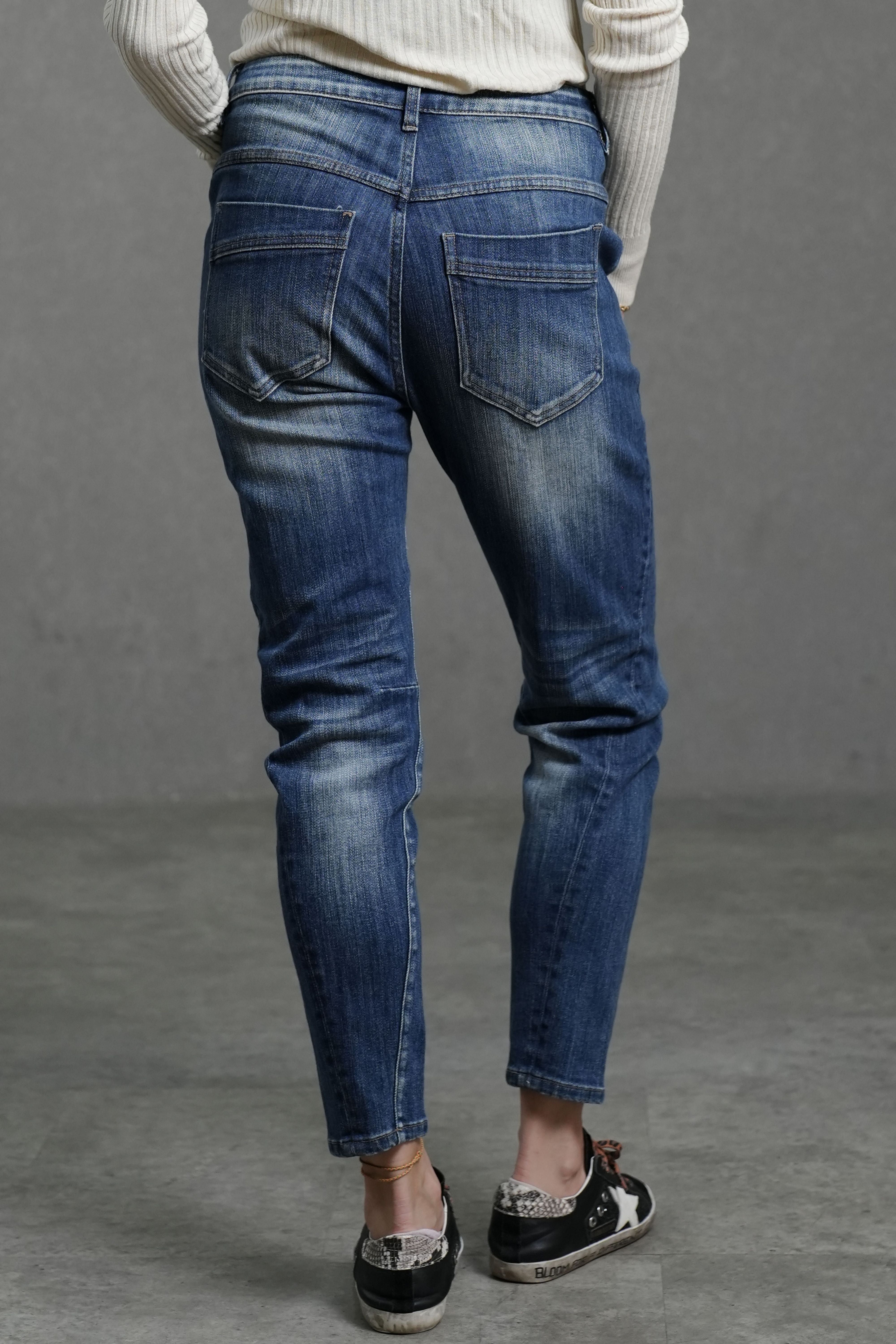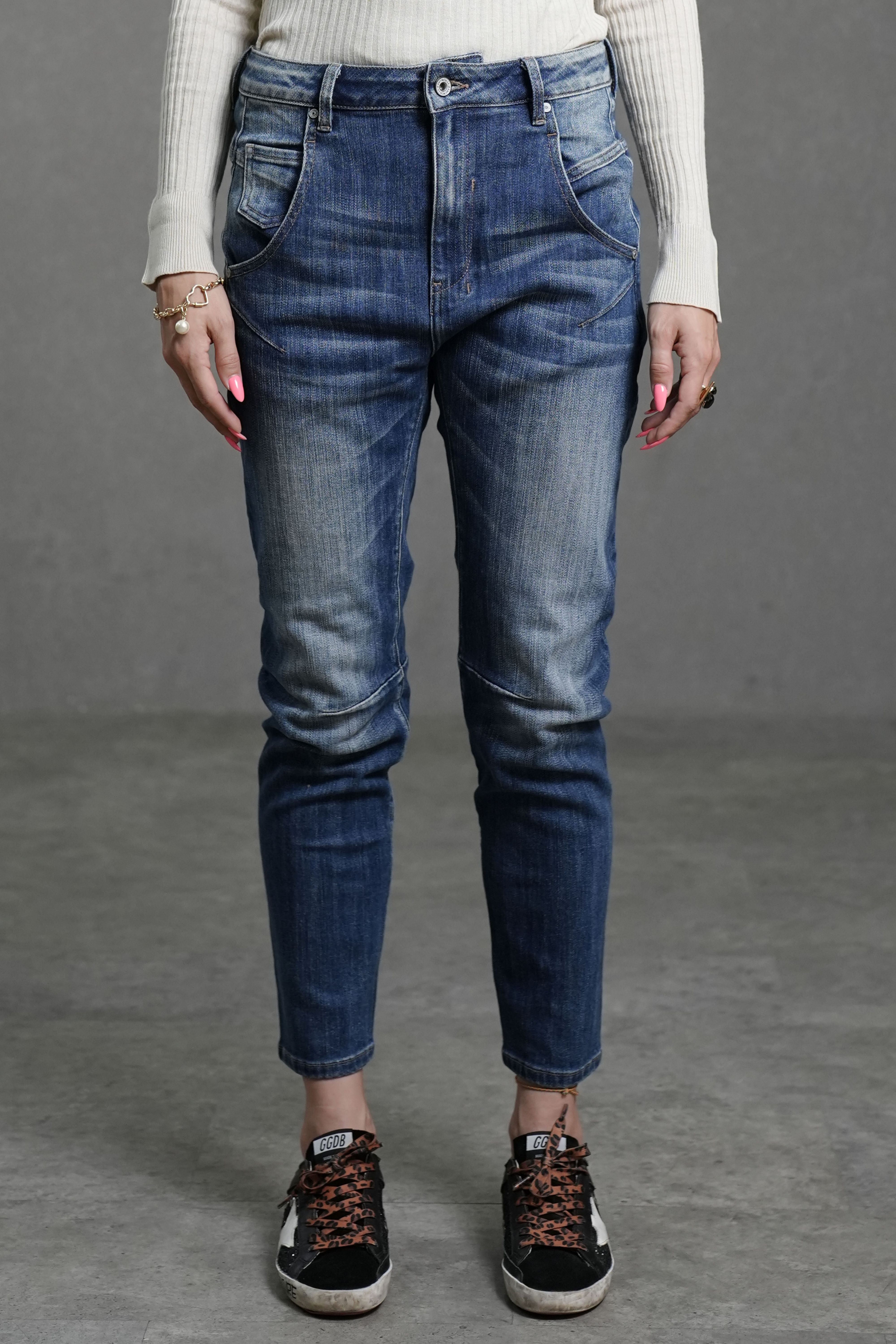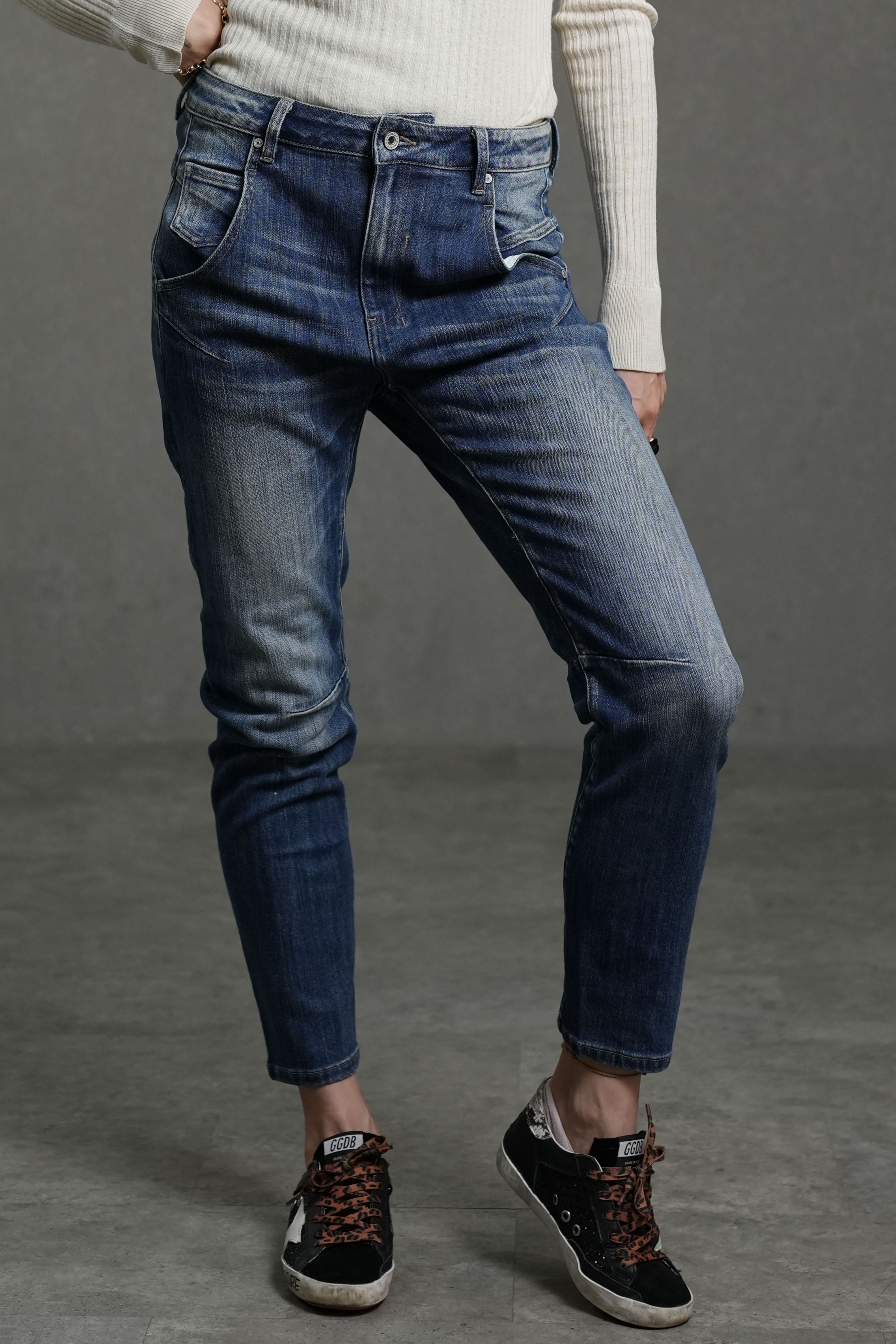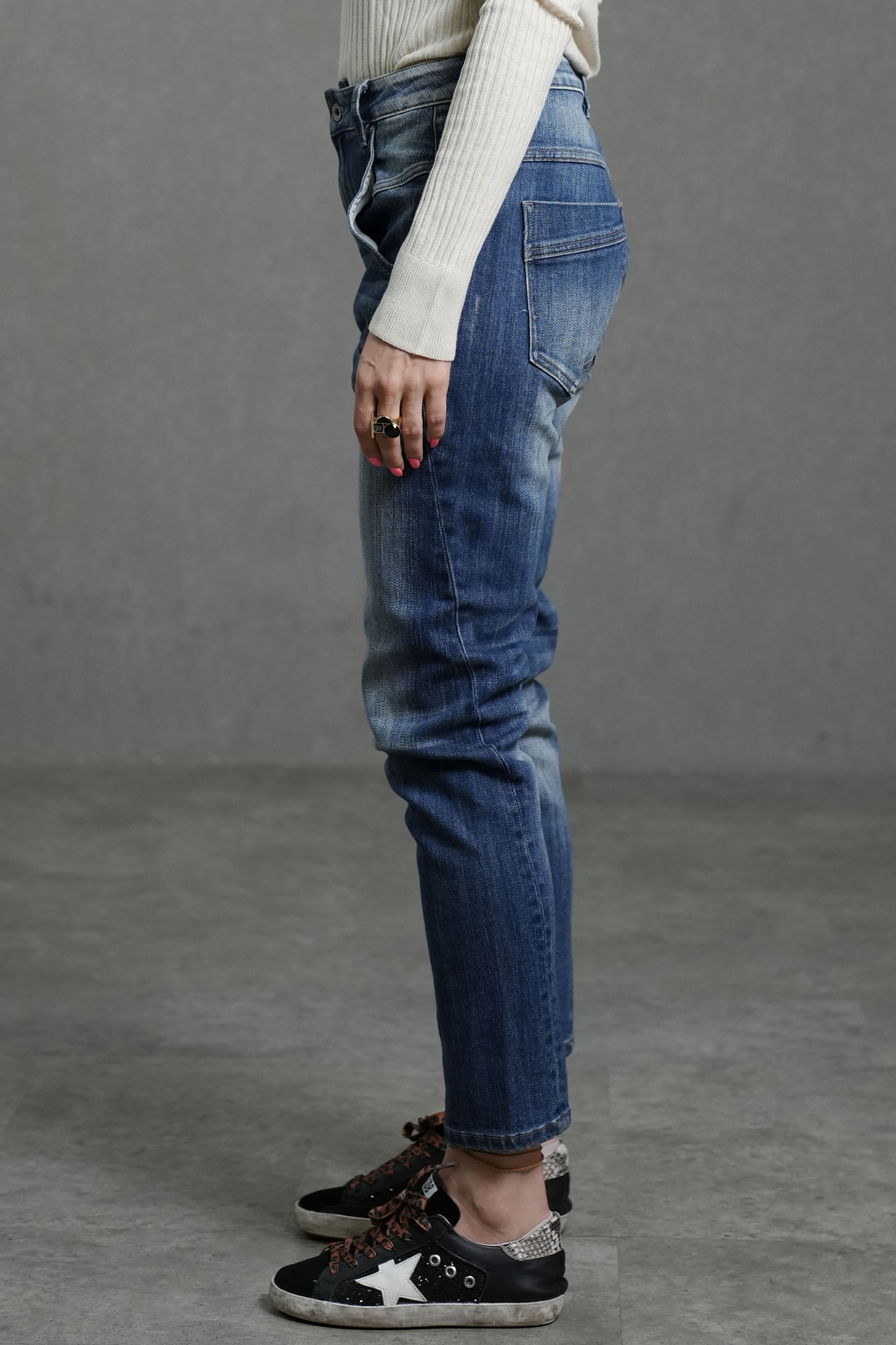 Confectionné dans un denim structuré à faible élasticité, ce jean conserve sa forme tout en offrant une liberté de mouvement naturelle. Sa taille mi-haute et sa coupe slim dessinent une silhouette équilibrée et facile à porter au quotidien. Les légers effets délavés et moustaches apportent une allure décontractée et authentique, idéale pour un style casual maîtrisé.