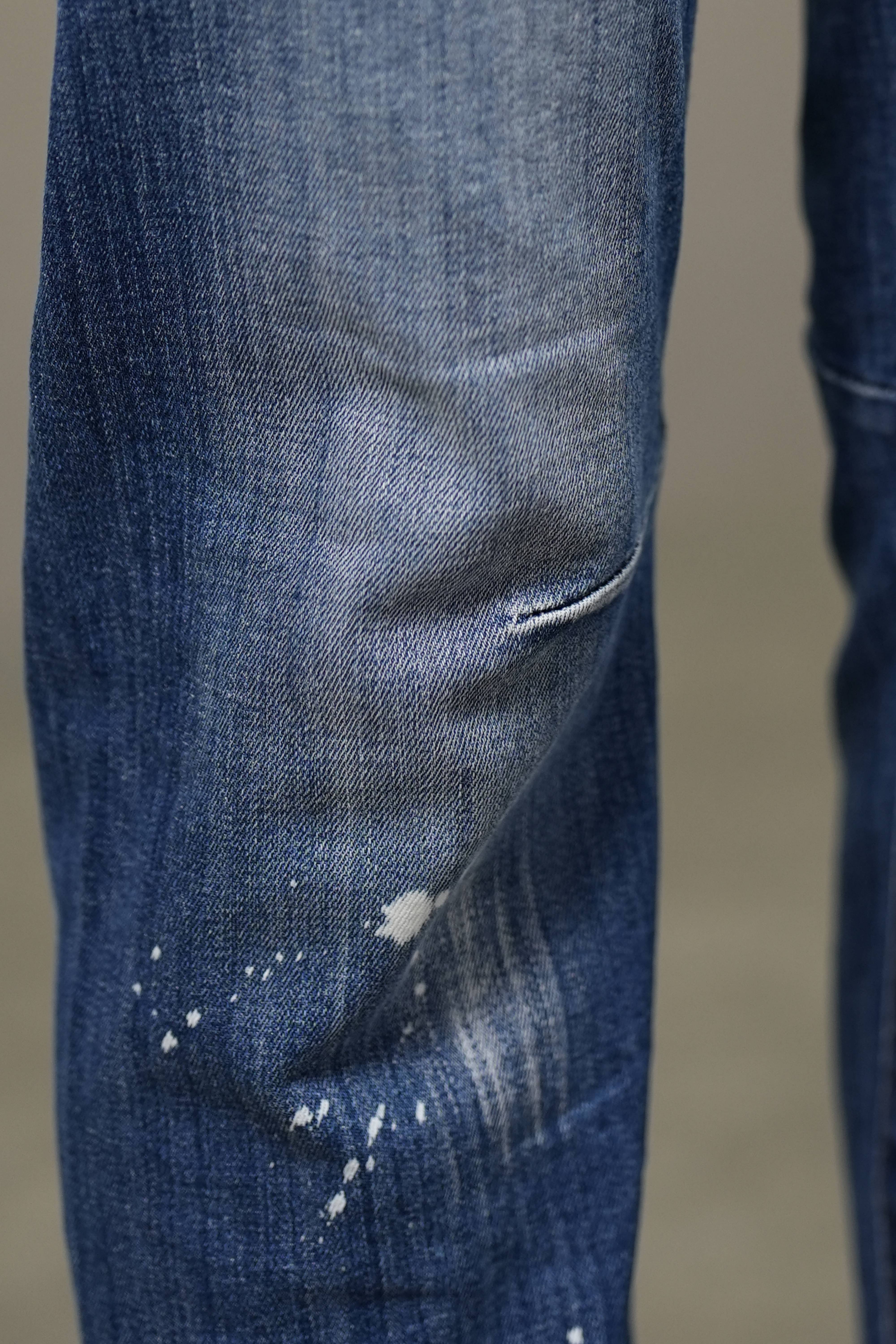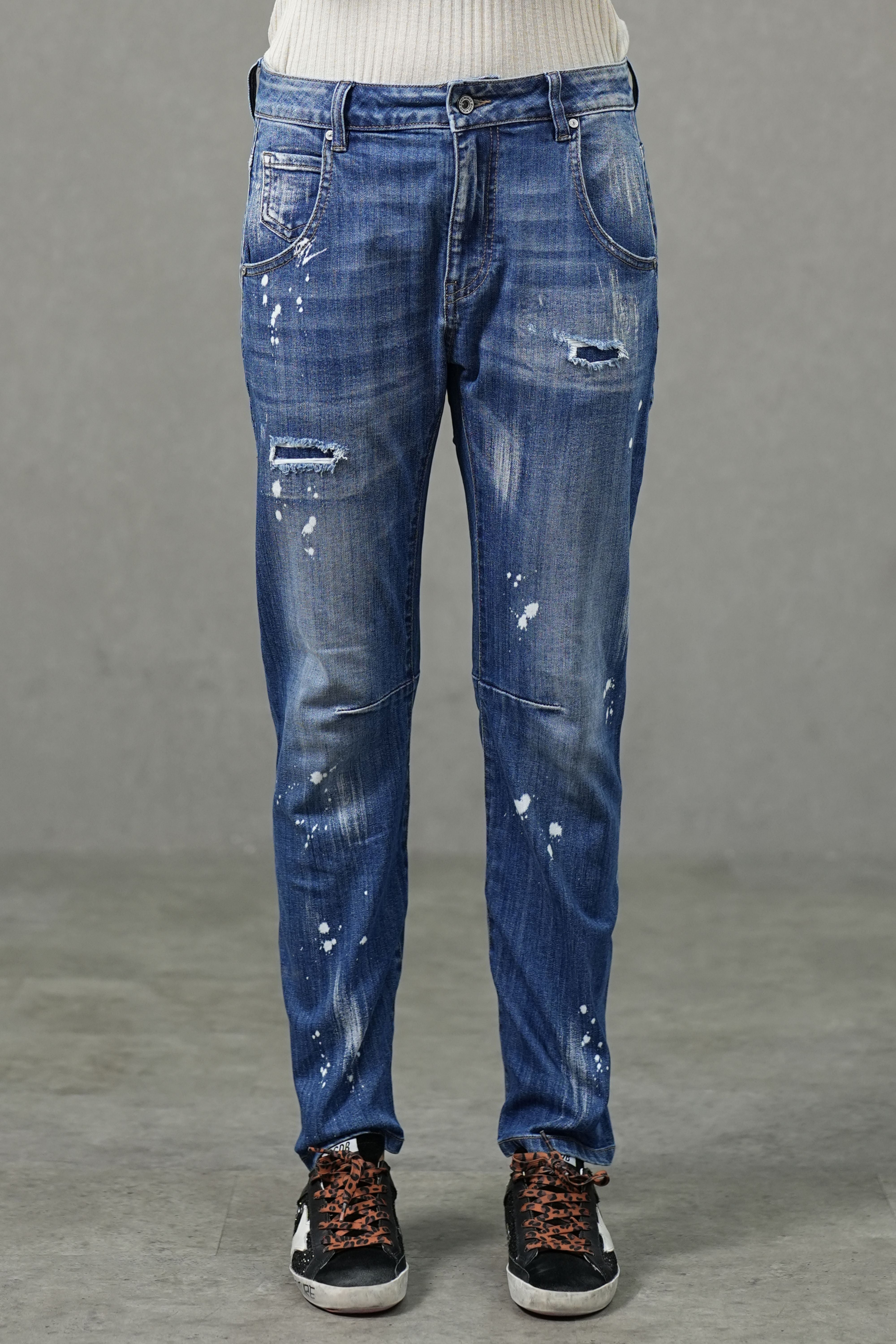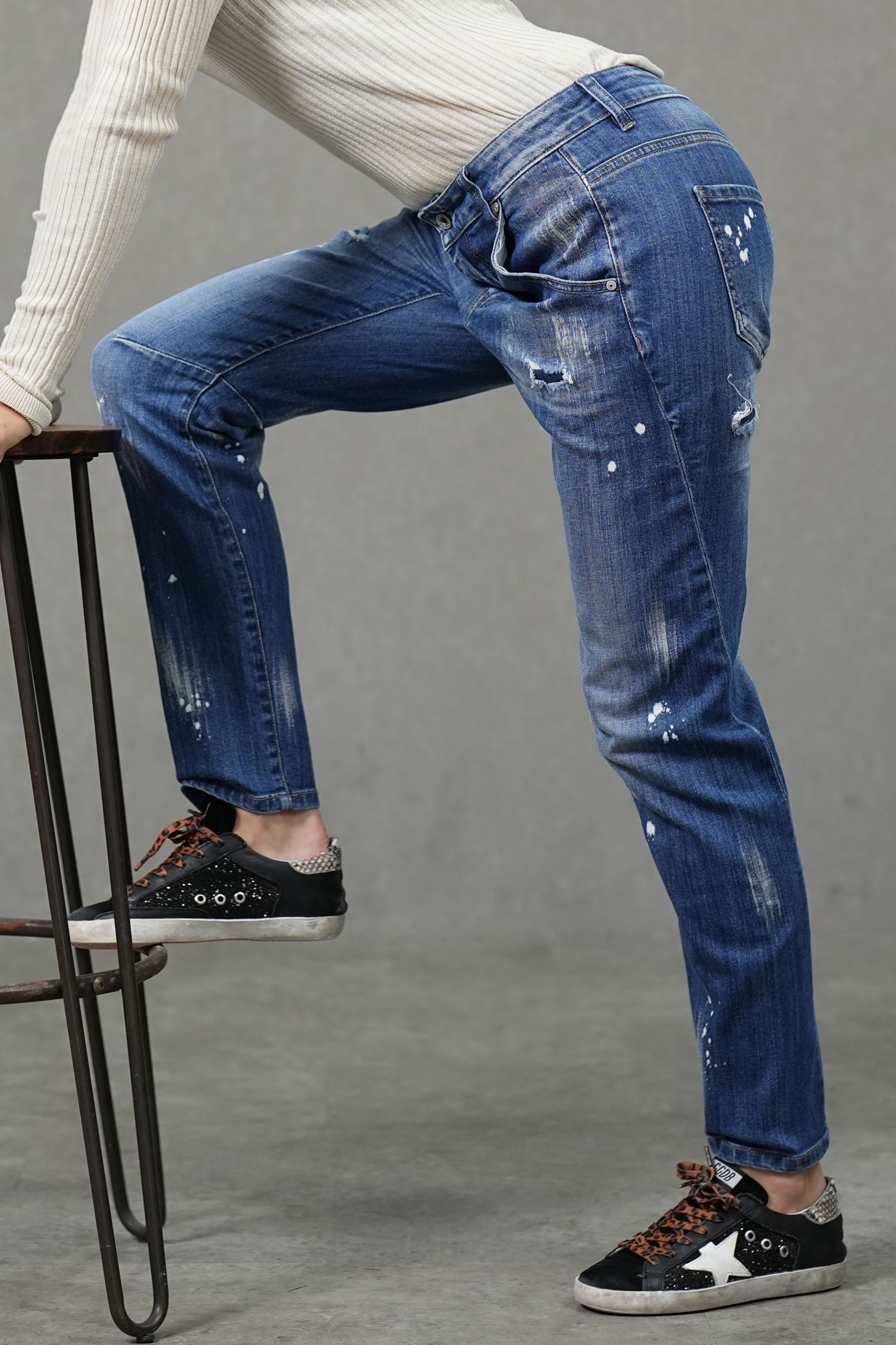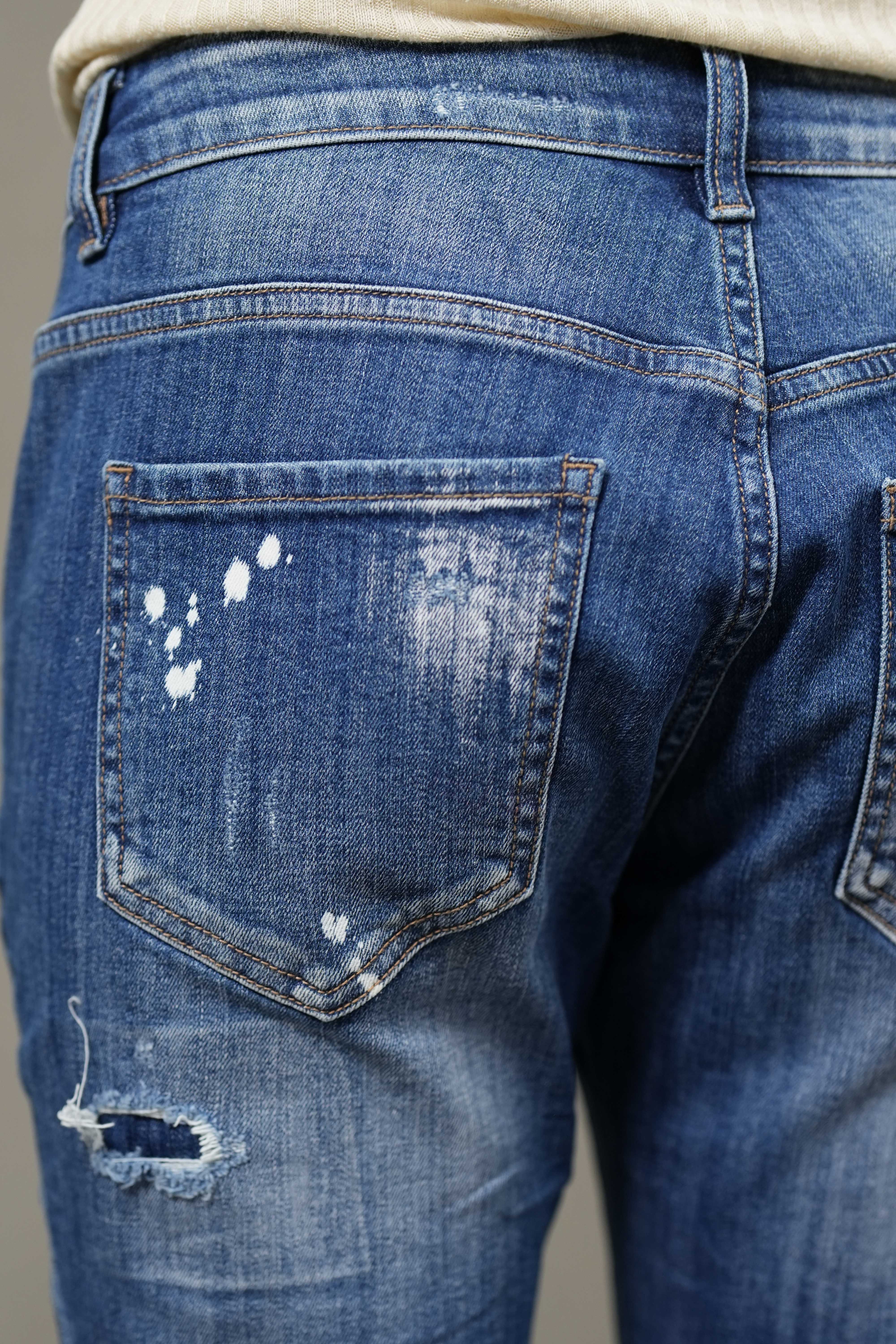 Jean bleu moyen coupe slim stretch moyen à effet usé et taches de peinture