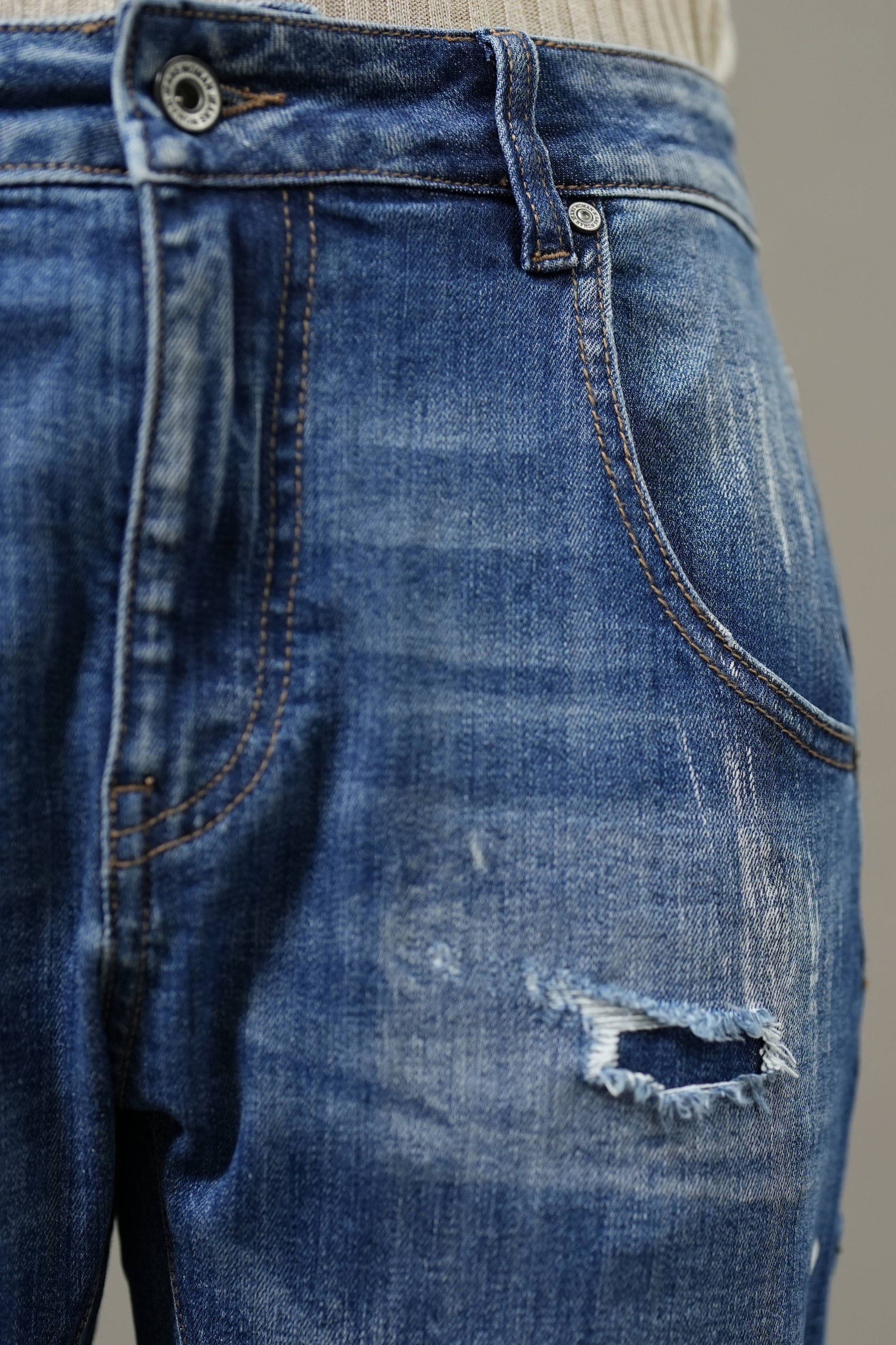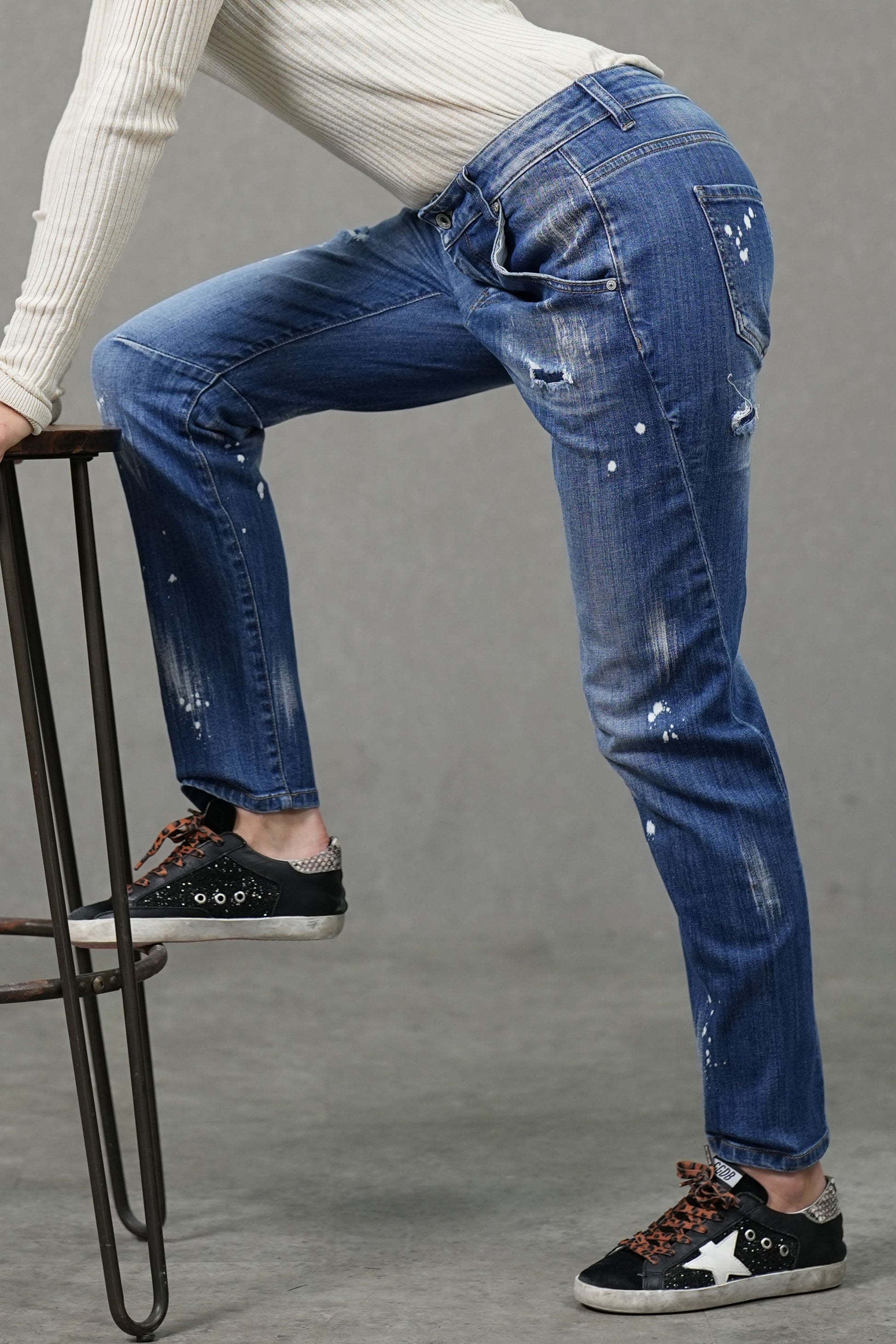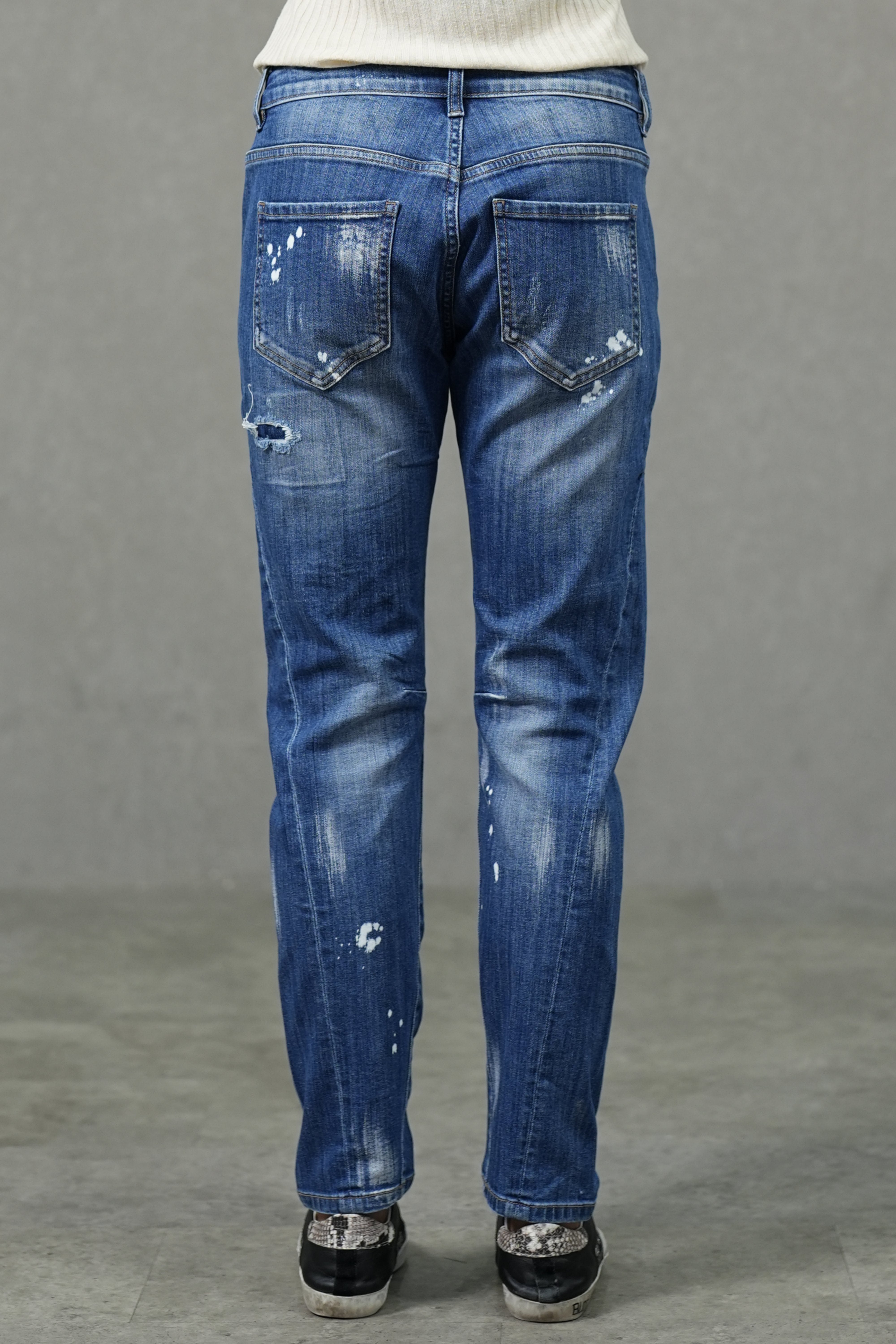 Ce jean bleu moyen associe un léger délavage, des détails usés et de subtiles éclaboussures de peinture blanche pour un esprit décontracté et résolument moderne. Sa taille mi-haute et sa coupe slim allongent la silhouette tout en restant confortables grâce au denim stretch moyen, idéal pour un porté souple et stylé au quotidien.