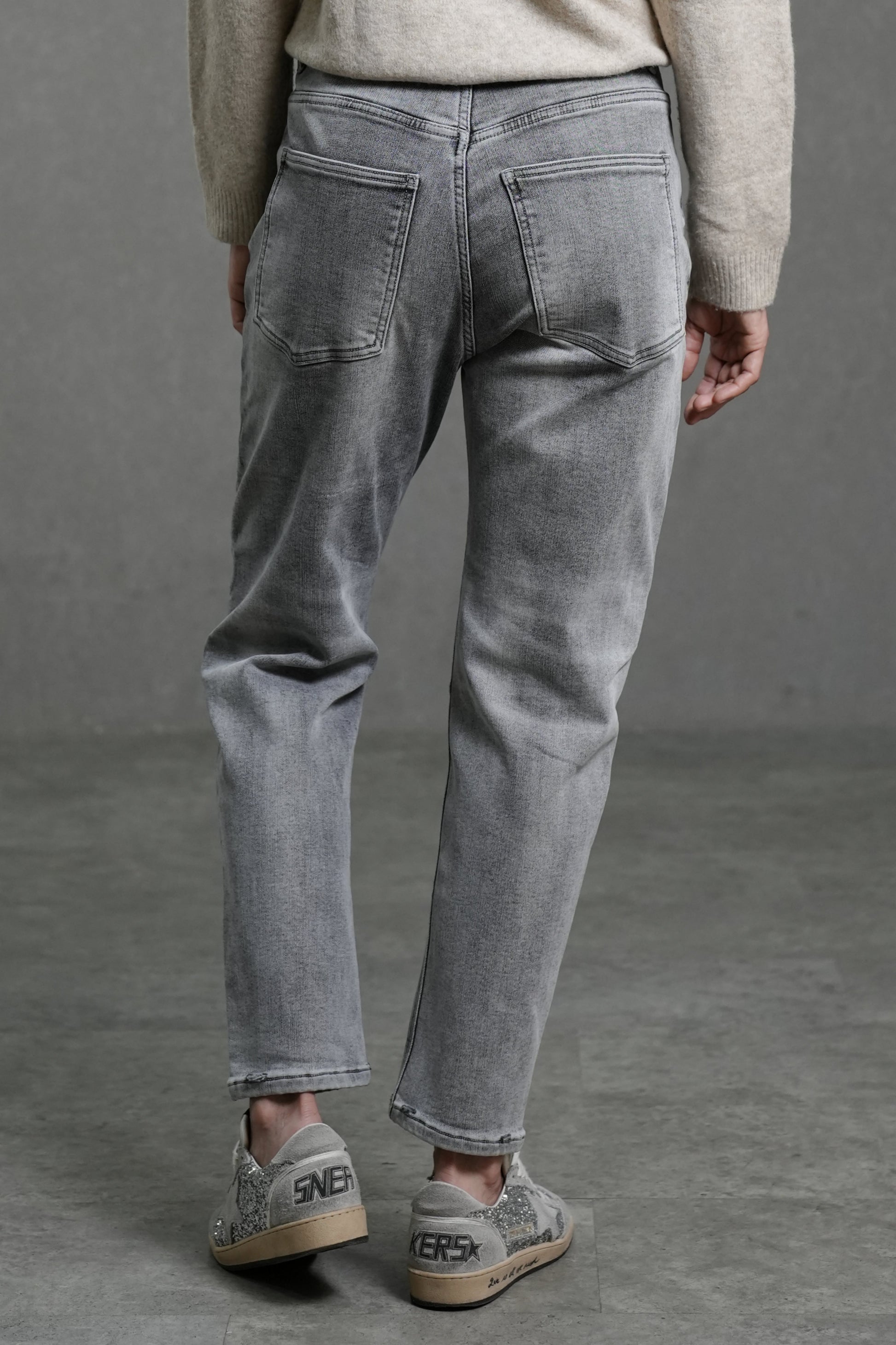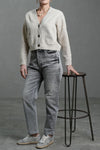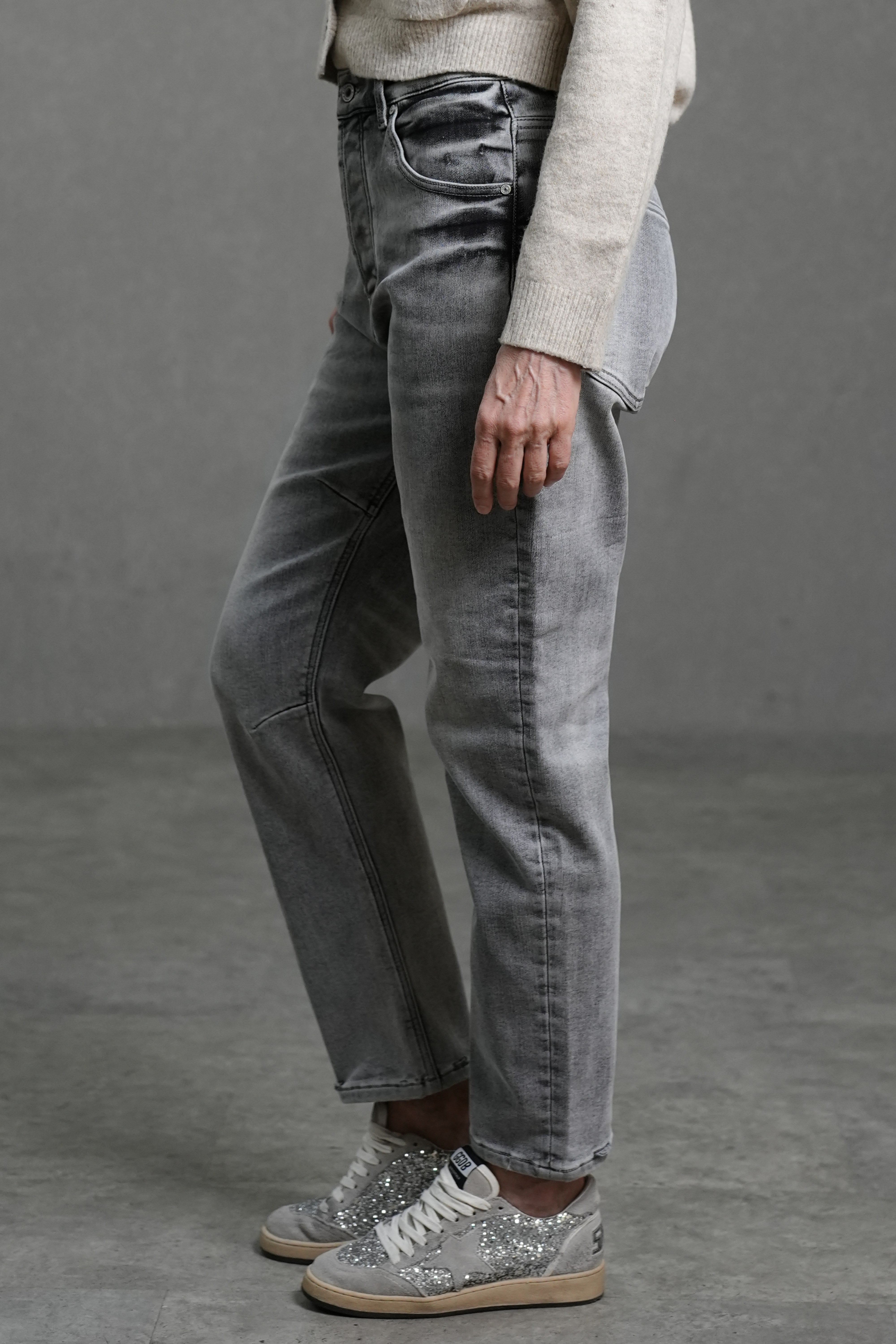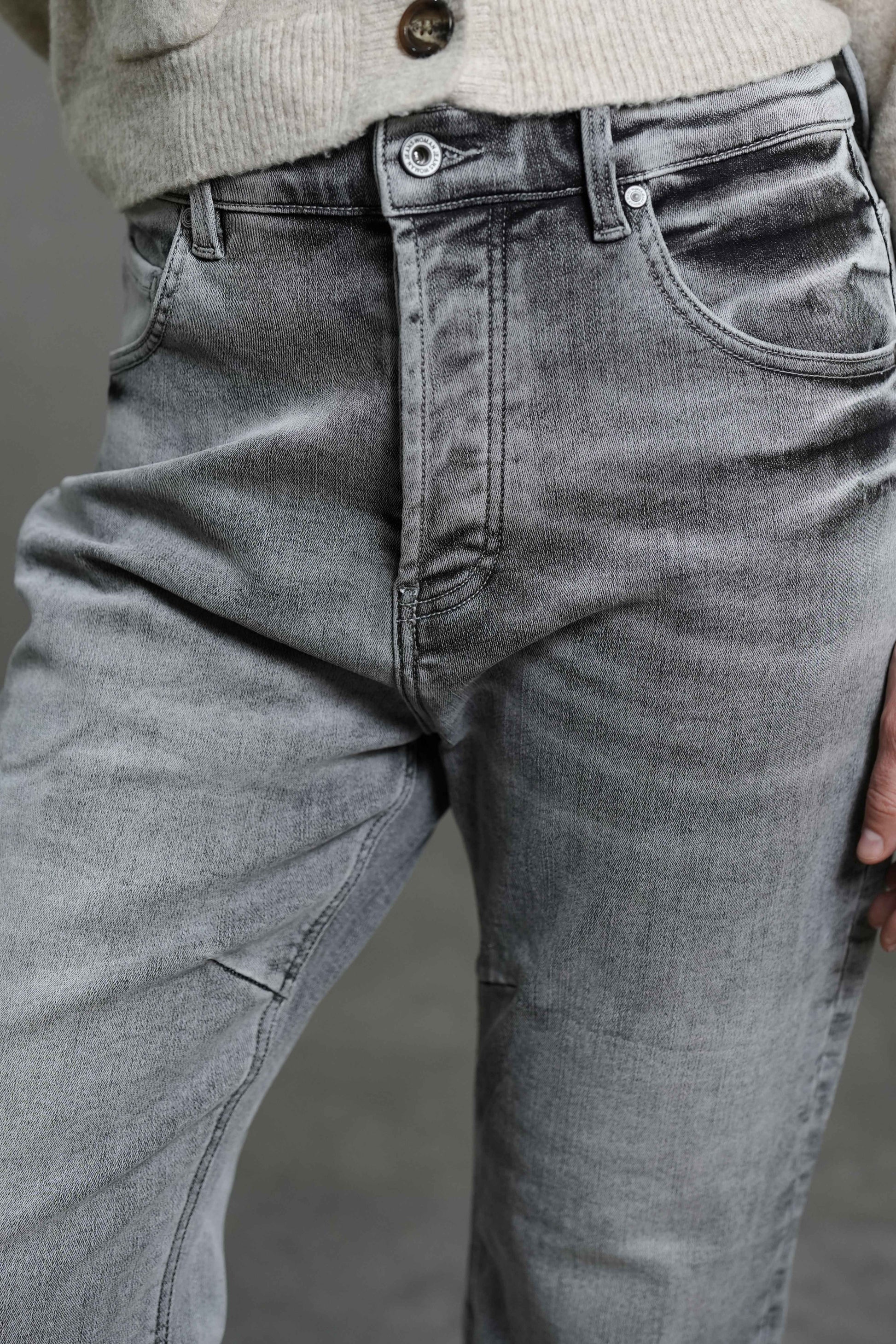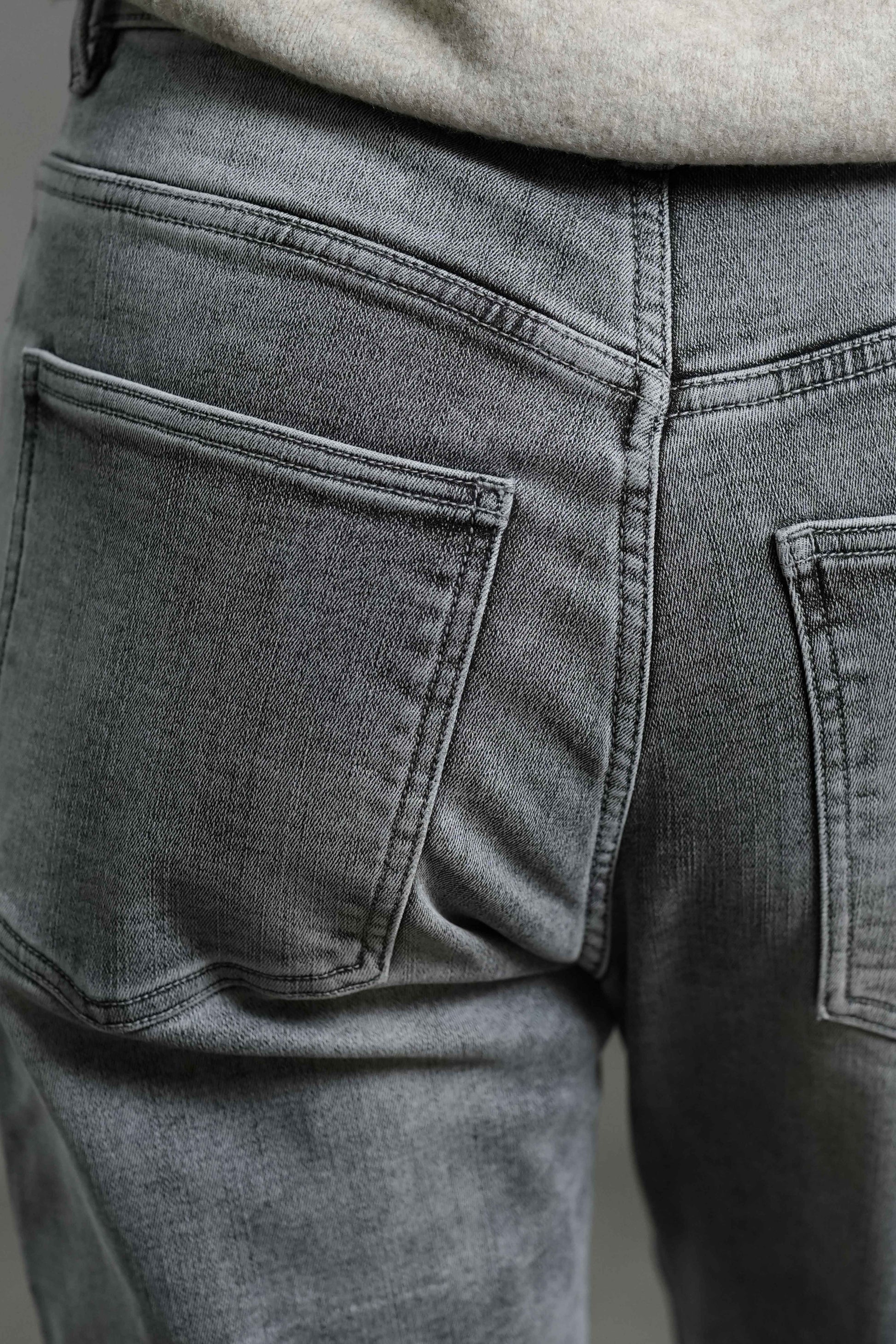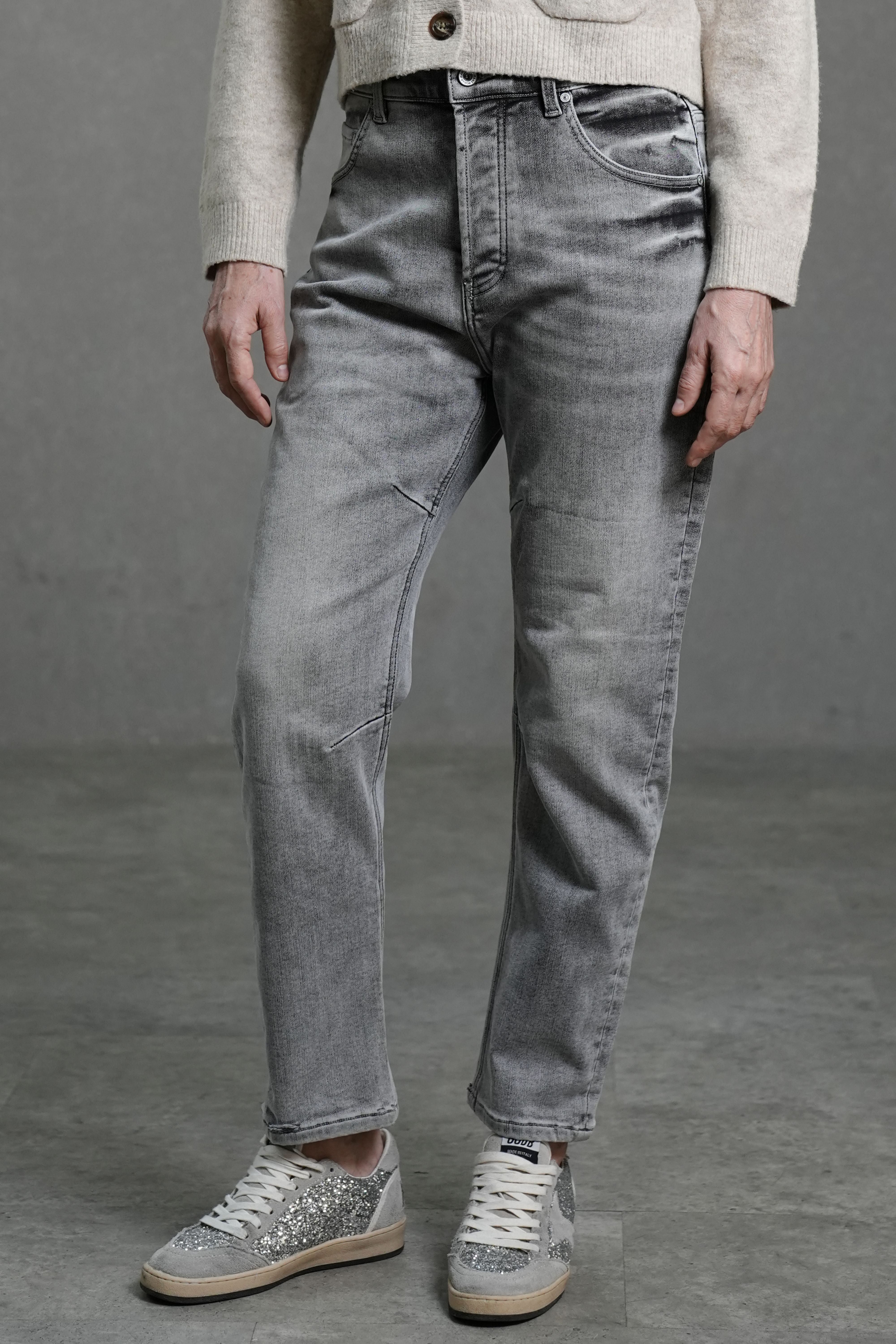 Confectionné dans un denim doux et très stretch, ce jean s’adapte parfaitement à la silhouette — près du corps sans jamais comprimer, pour un confort absolu tout au long de la journée. Les légères usures et les coutures au niveau des genoux apportent une touche contemporaine et structurée.