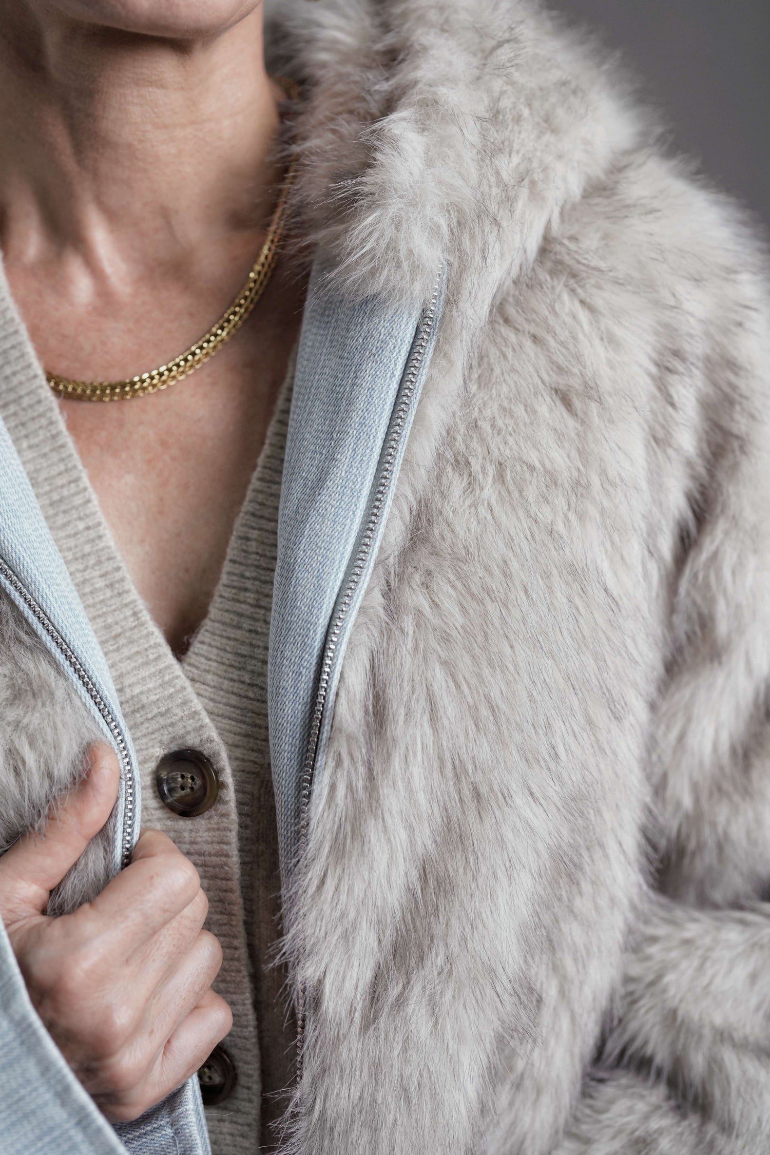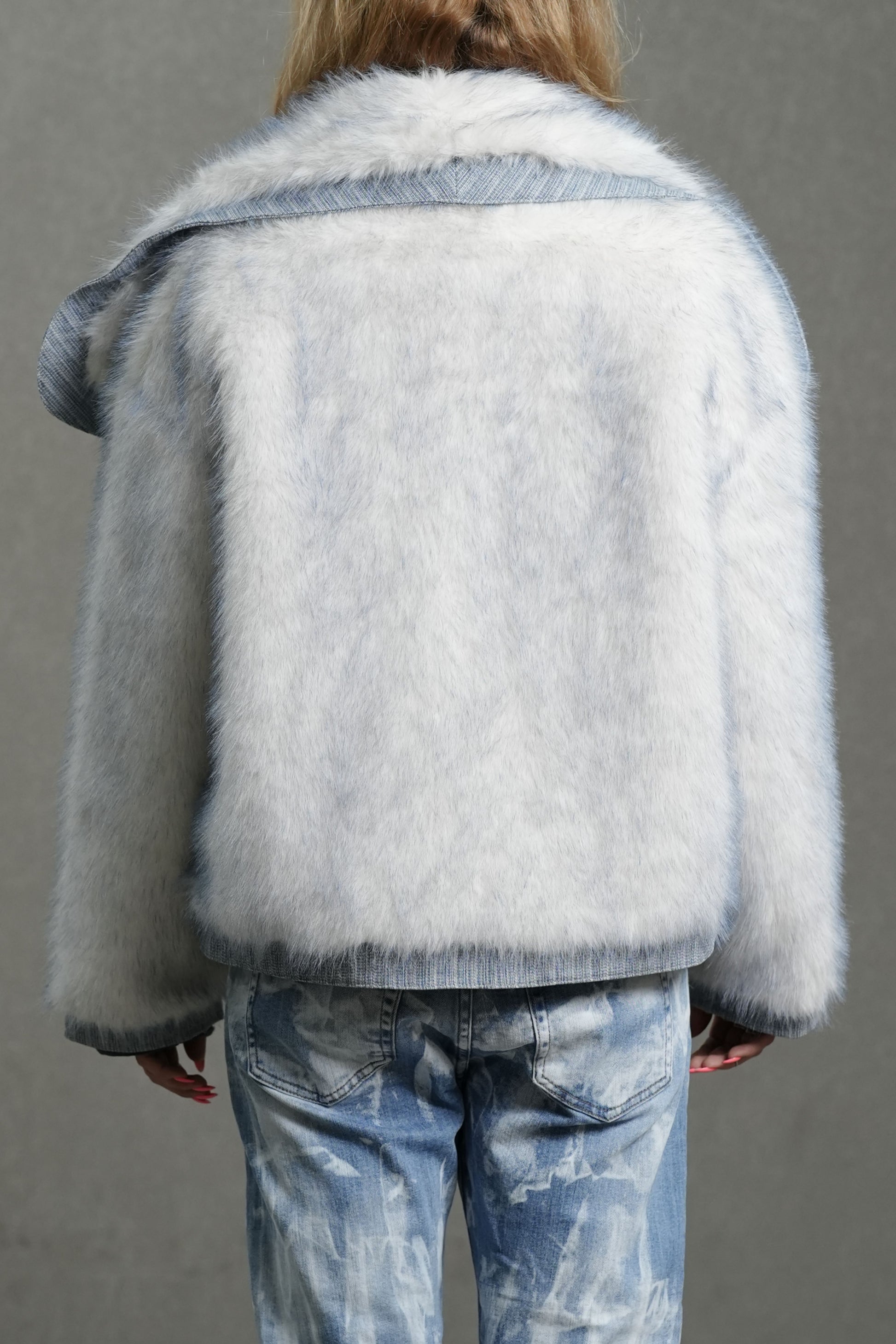 Manteau en fausse fourrure dégradée bleu glacé avec finitions en denim