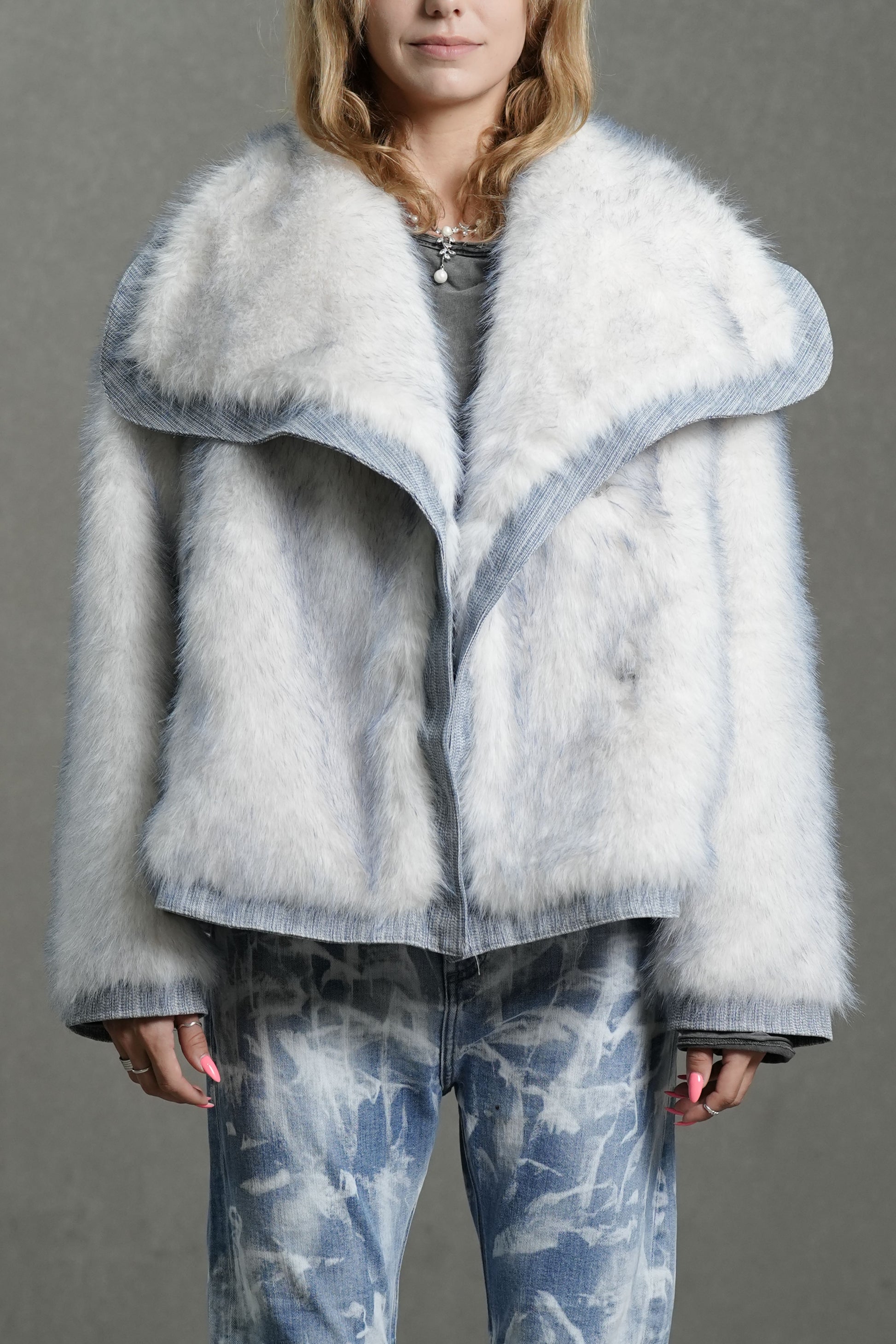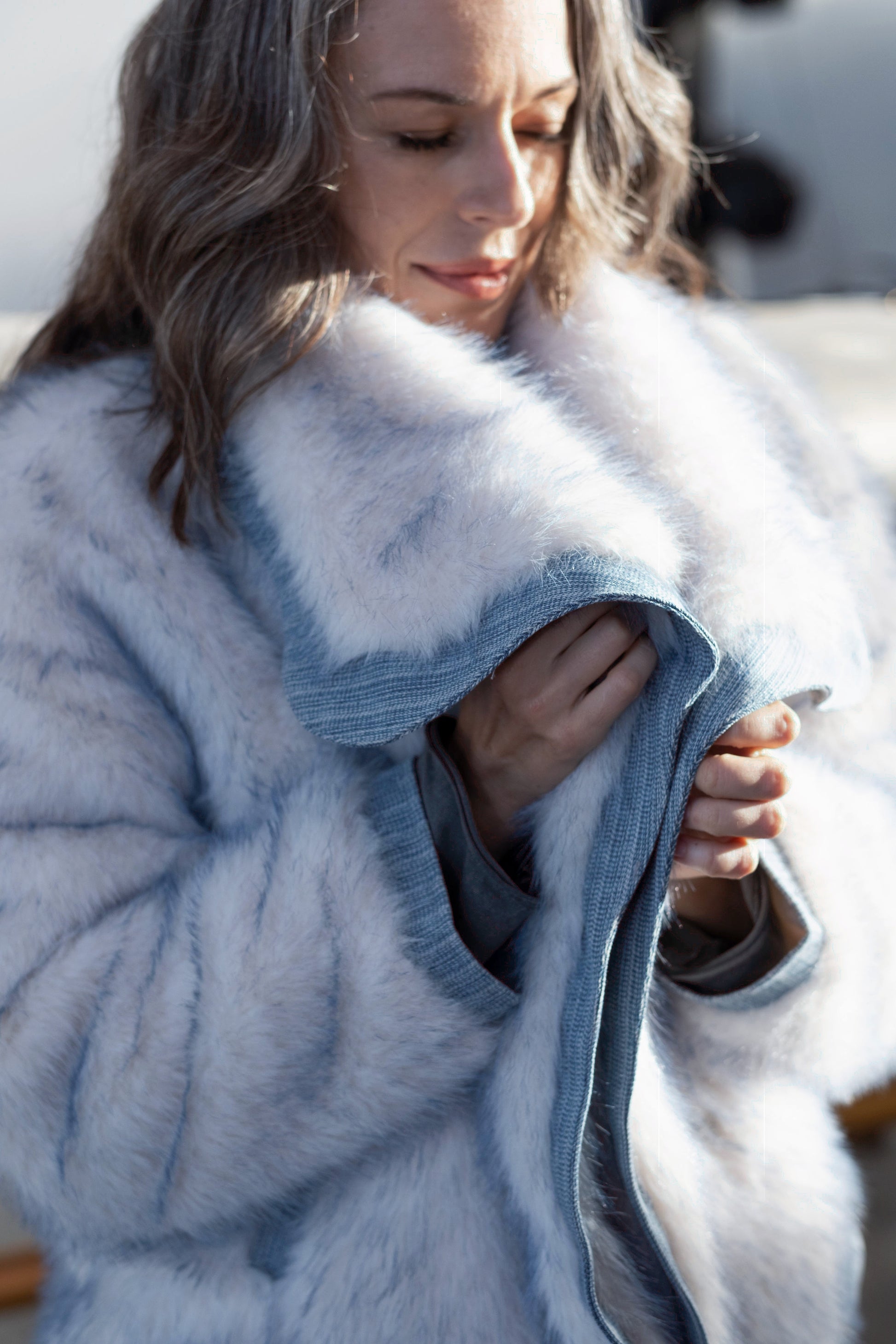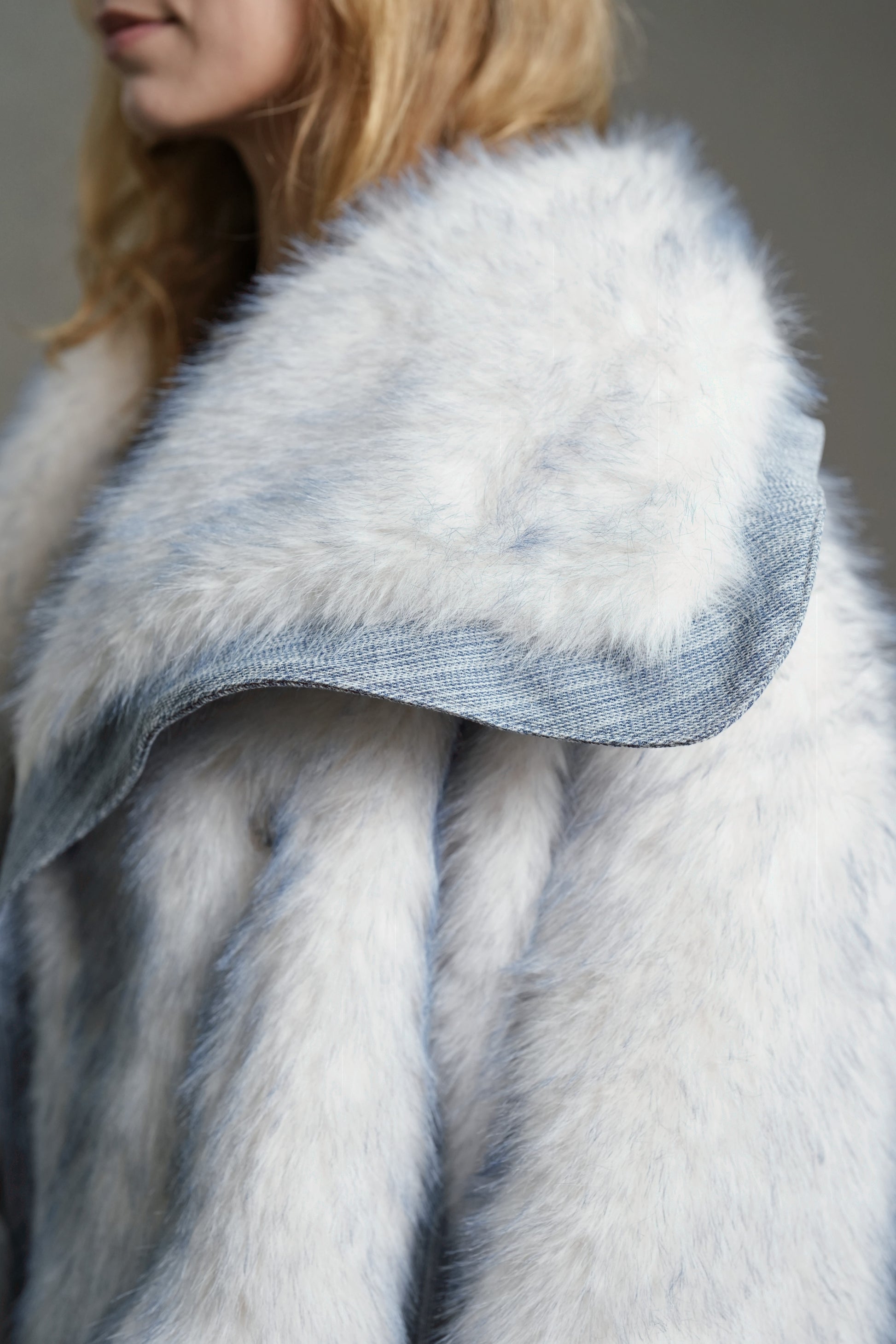 Mots-clés : Fausse fourrure, dégradé bleu glacé, finitions denim, coupe ample, texture douce, manteau d’hiver