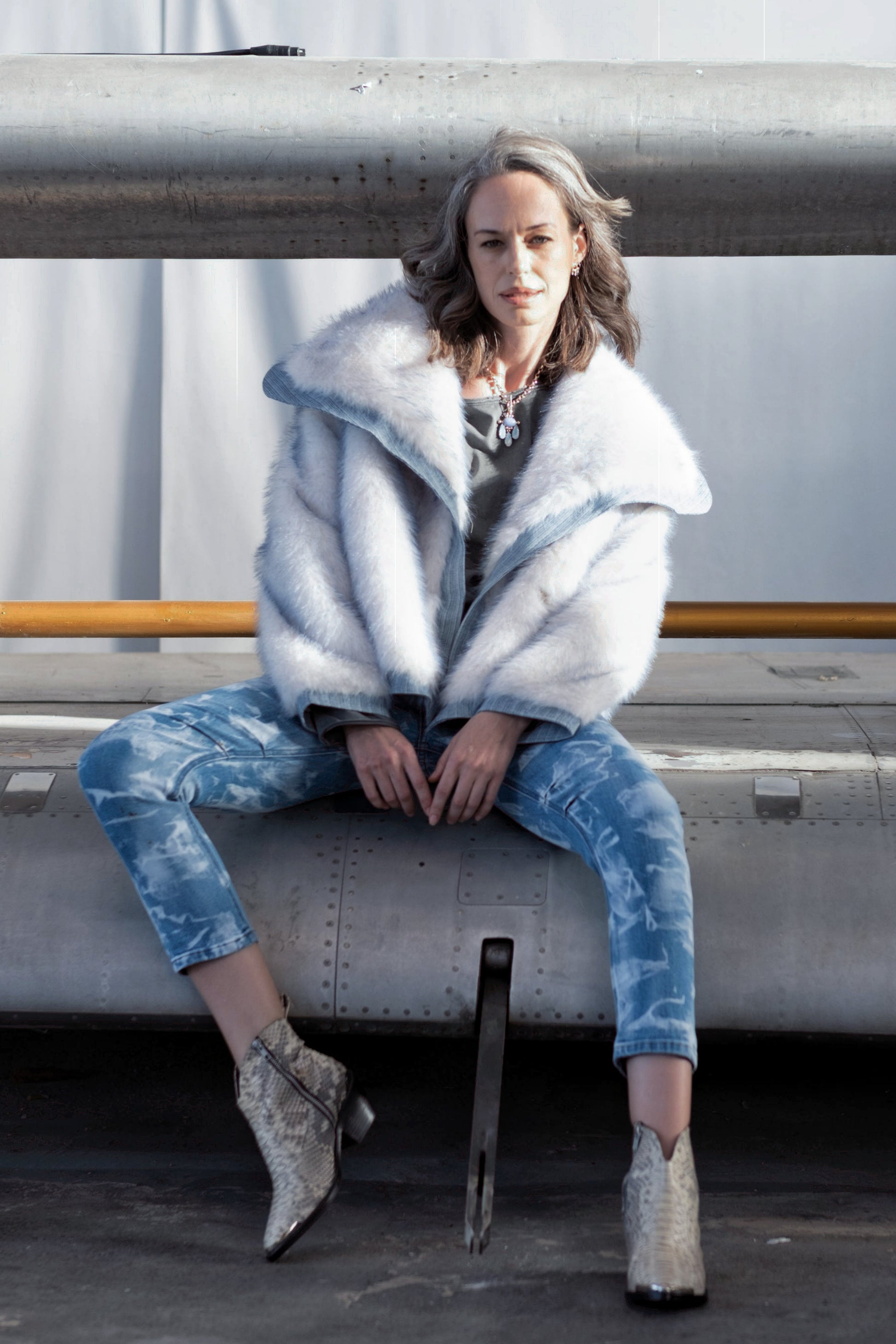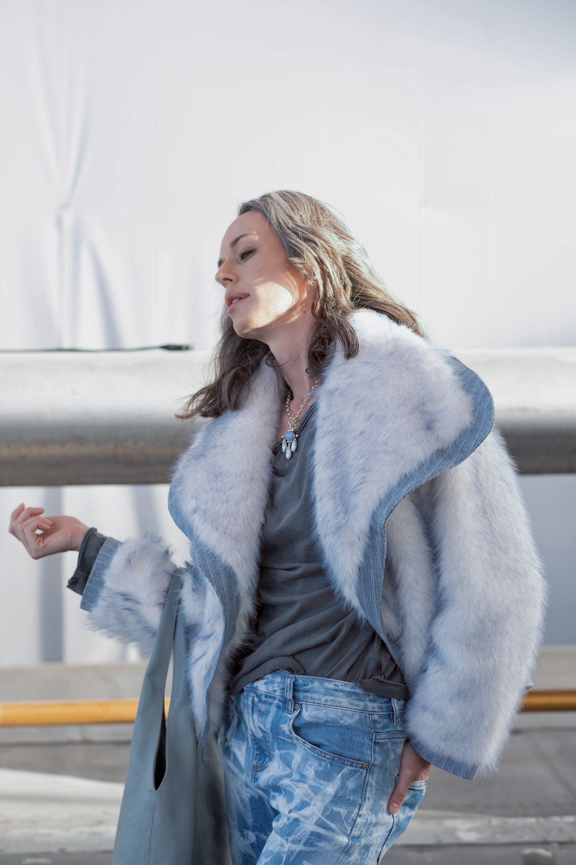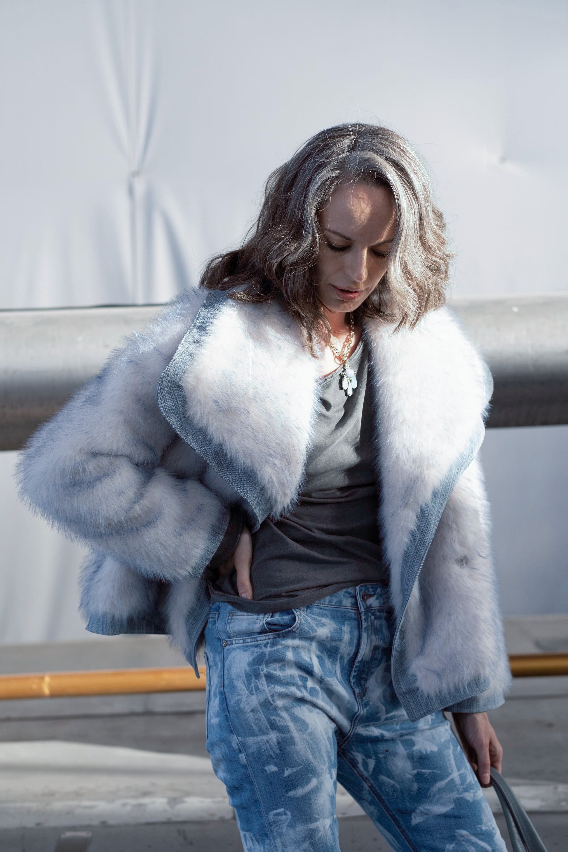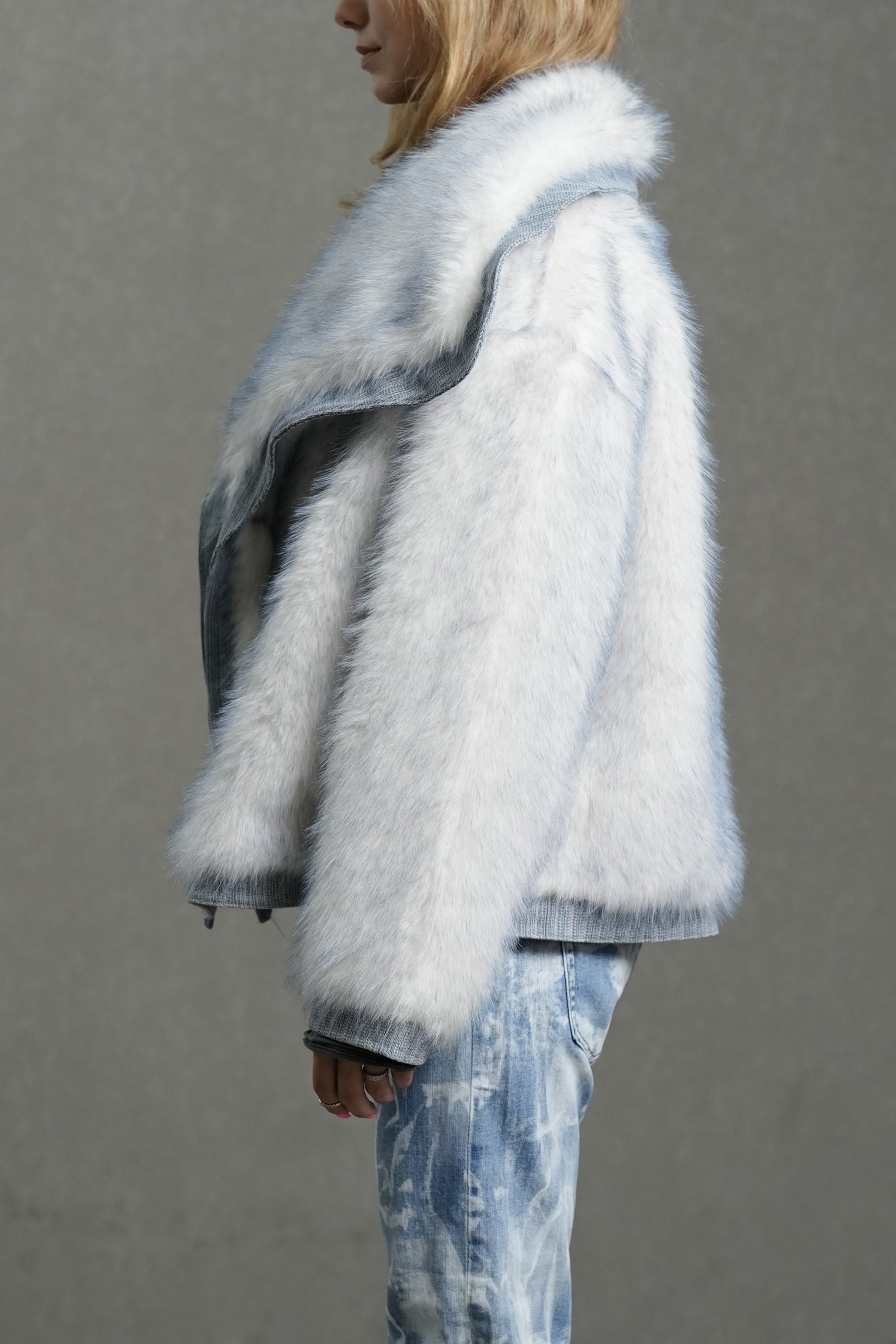 Mots-clés : Fausse fourrure, dégradé bleu glacé, finitions denim, coupe ample, texture douce, manteau d’hiver