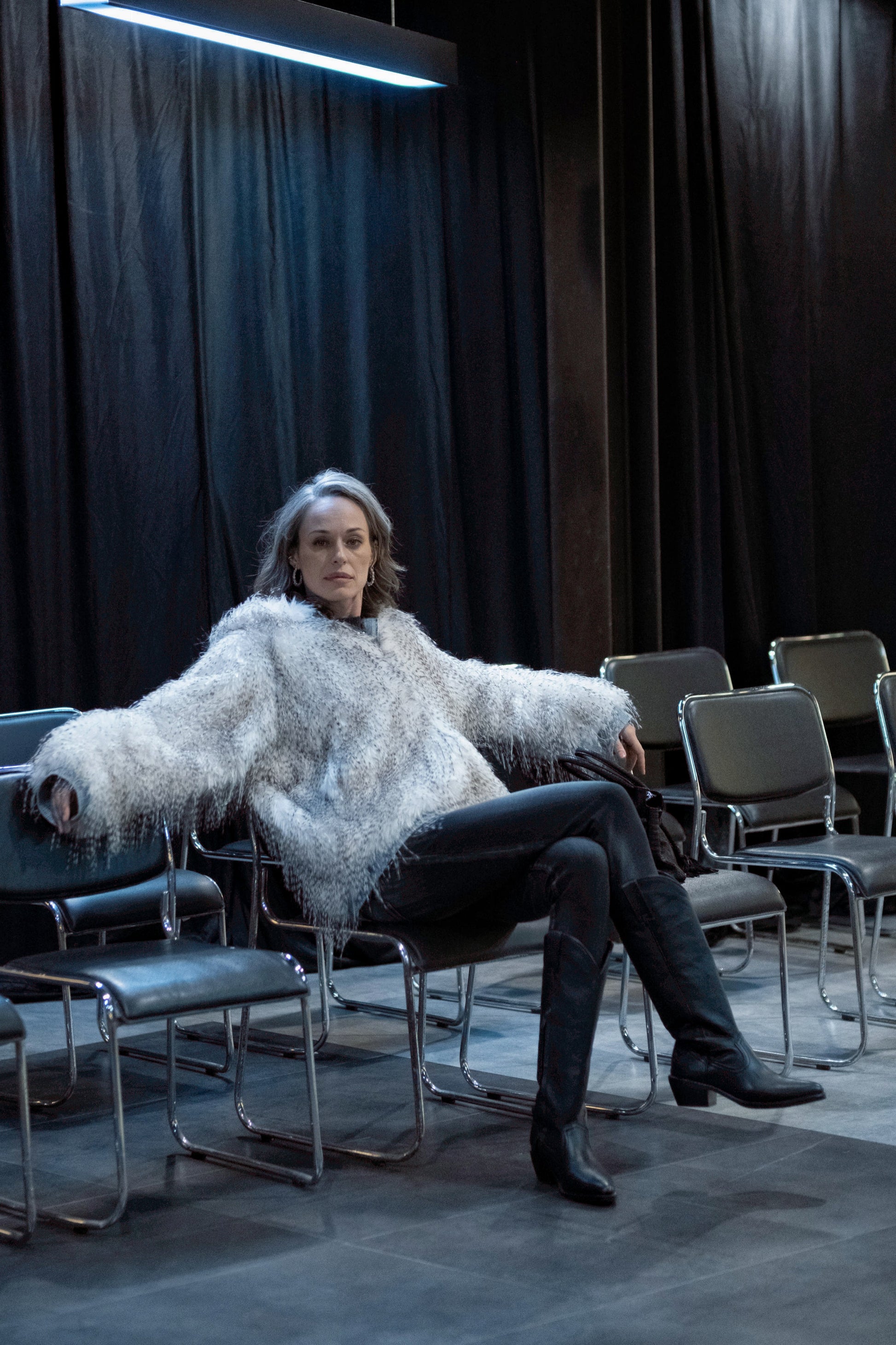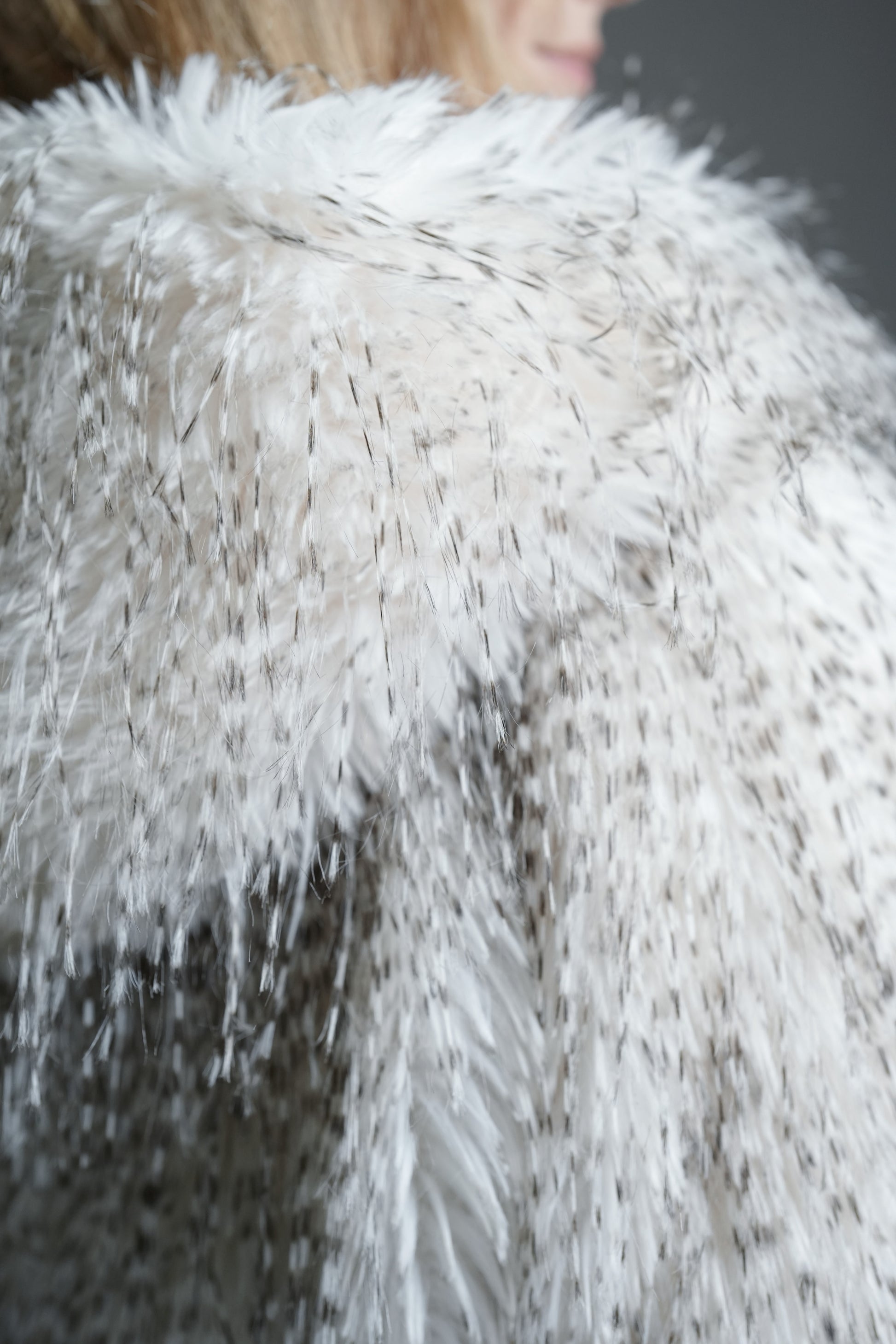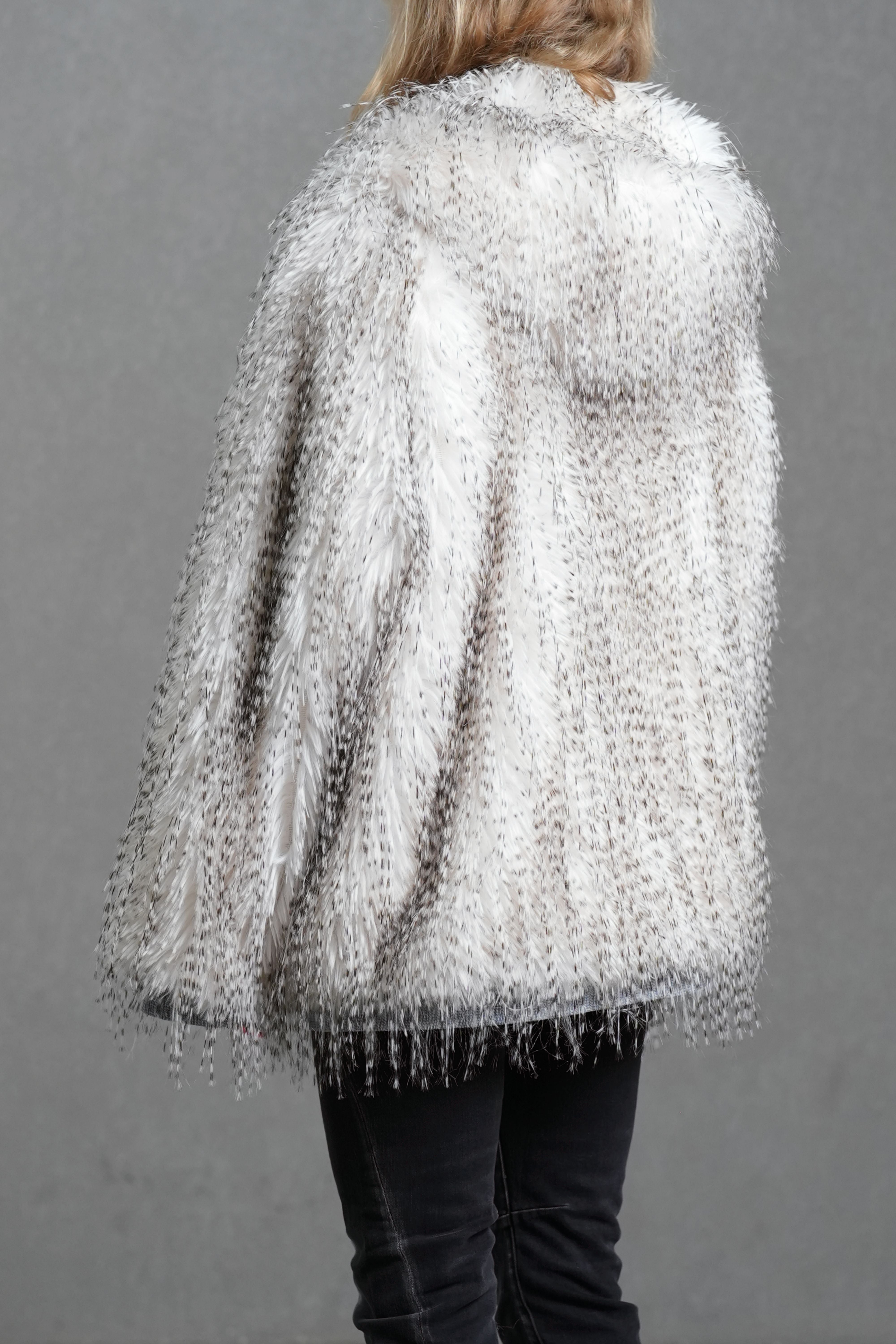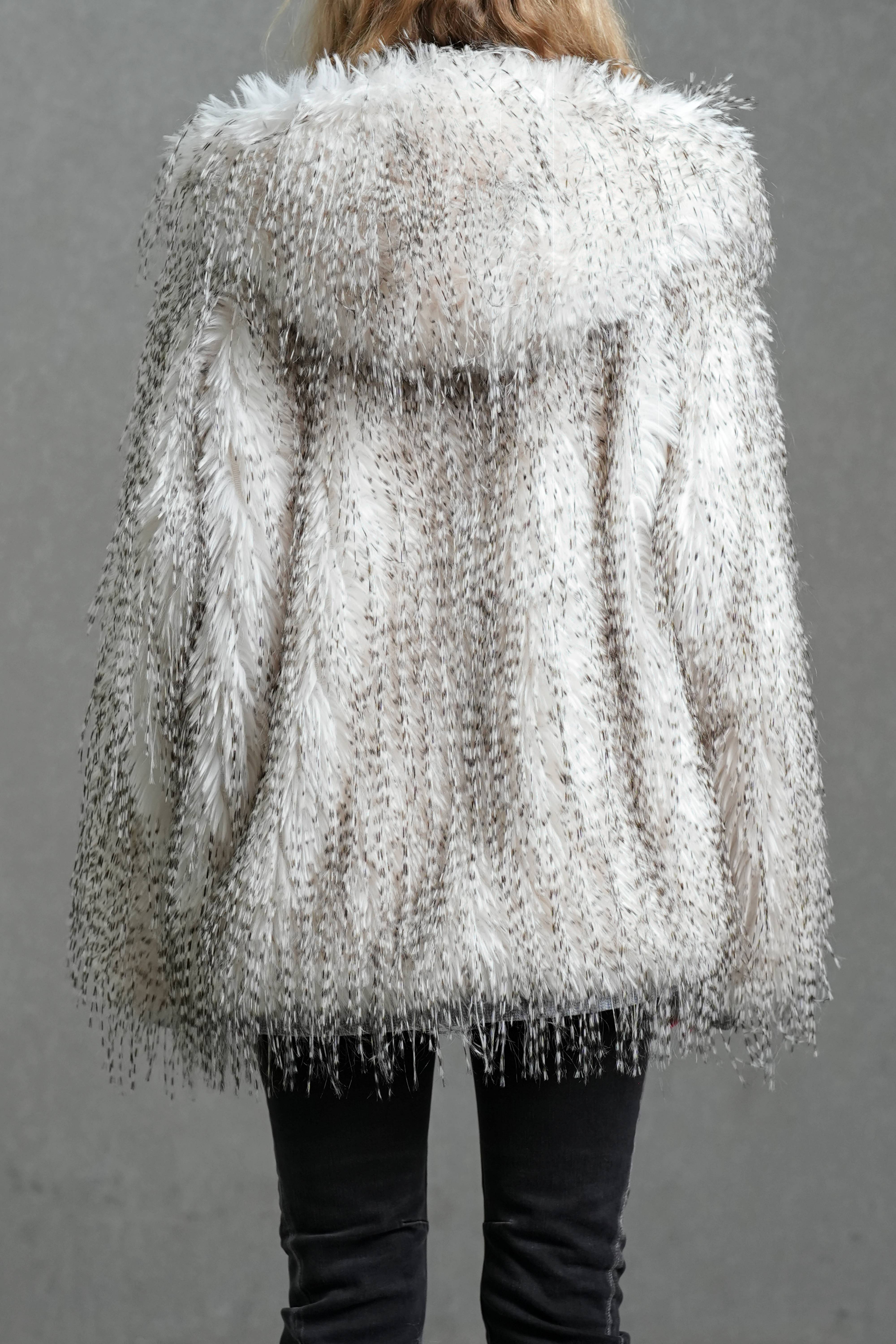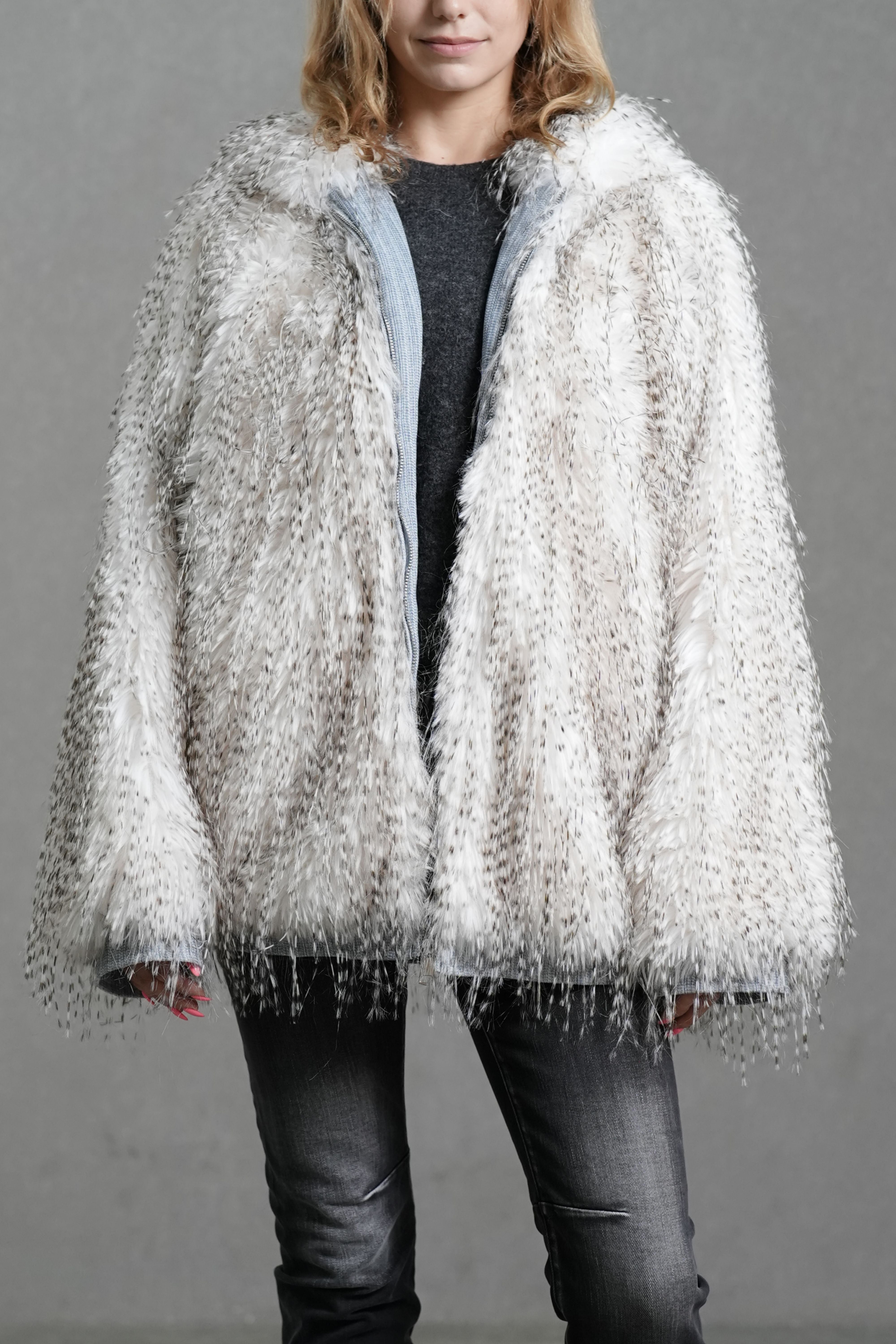 Ce manteau revisite la fausse fourrure classique dans une version moderne et lumineuse. Sa matière douce au dégradé blanc-gris apporte une touche raffinée, tandis que la coupe ample et la capuche enveloppante assurent chaleur et confort pour les journées d’hiver en ville. Les finitions en denim contrastant et la fermeture zippée sur le devant ajoutent une note contemporaine et décontractée.