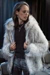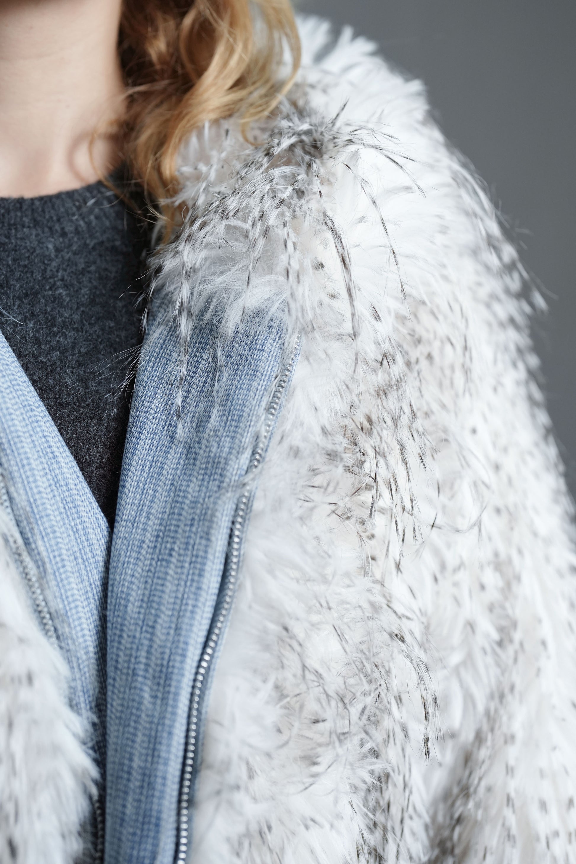 Manteau à capuche en fausse fourrure dégradée blanc-gris avec finitions en denim