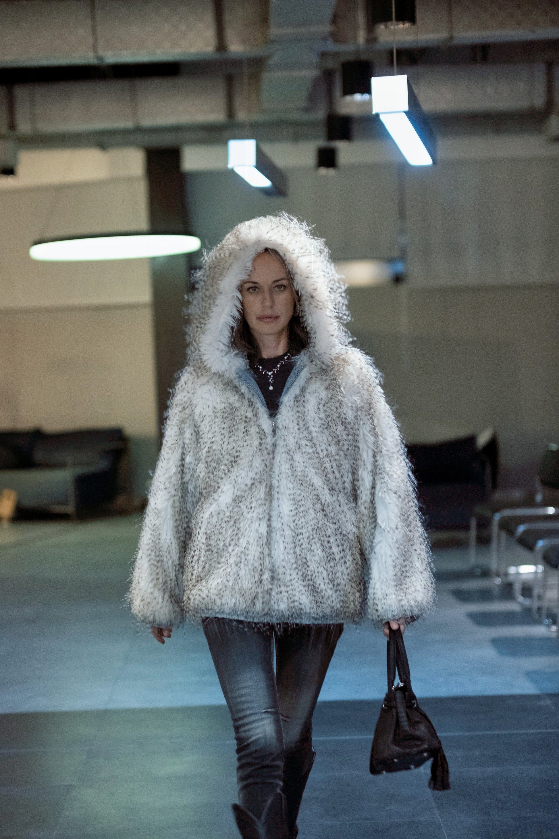 Mots-clés : Fausse fourrure, manteau à capuche, finitions denim, effet dégradé, coupe ample, manteau d’hiver