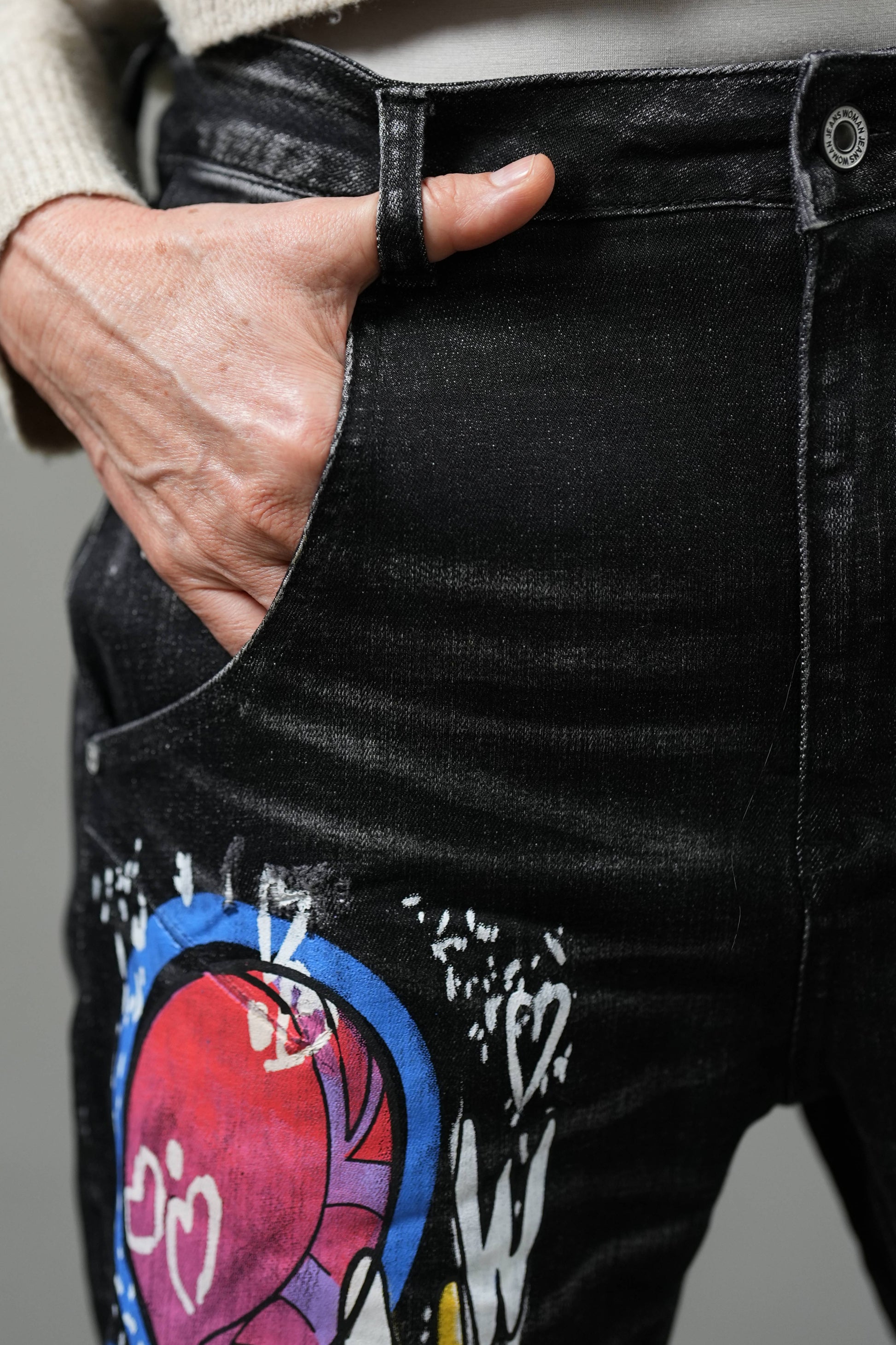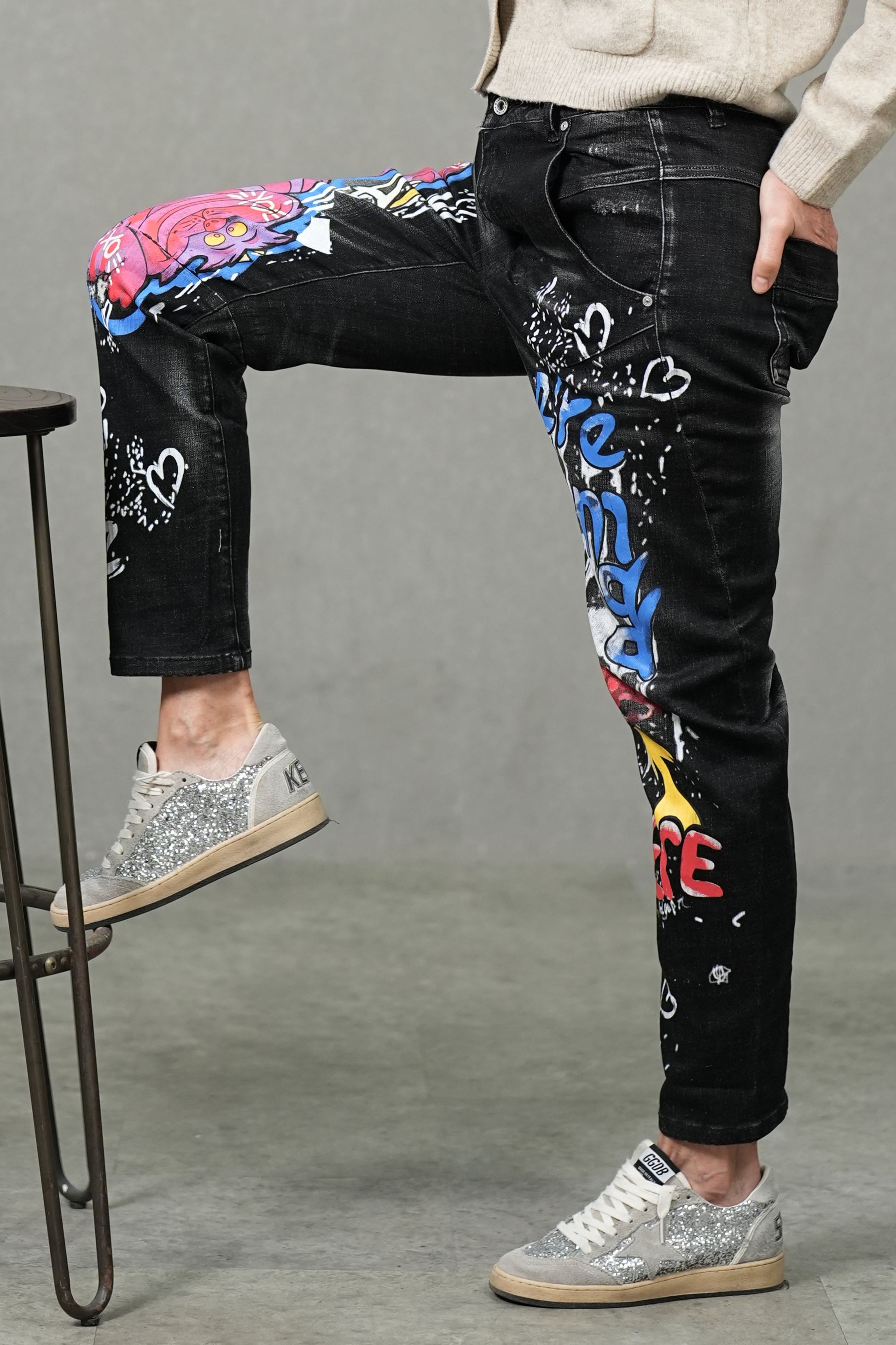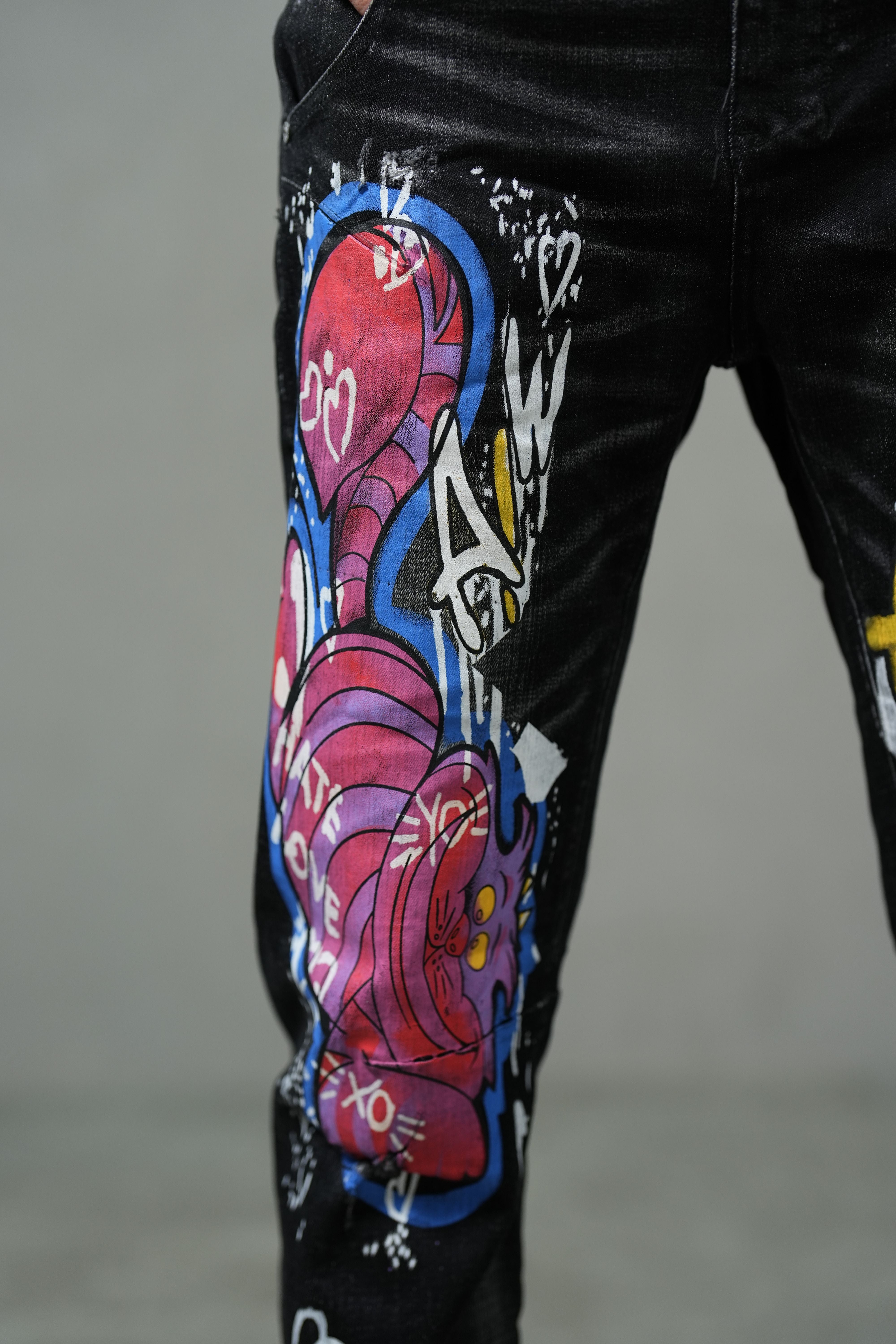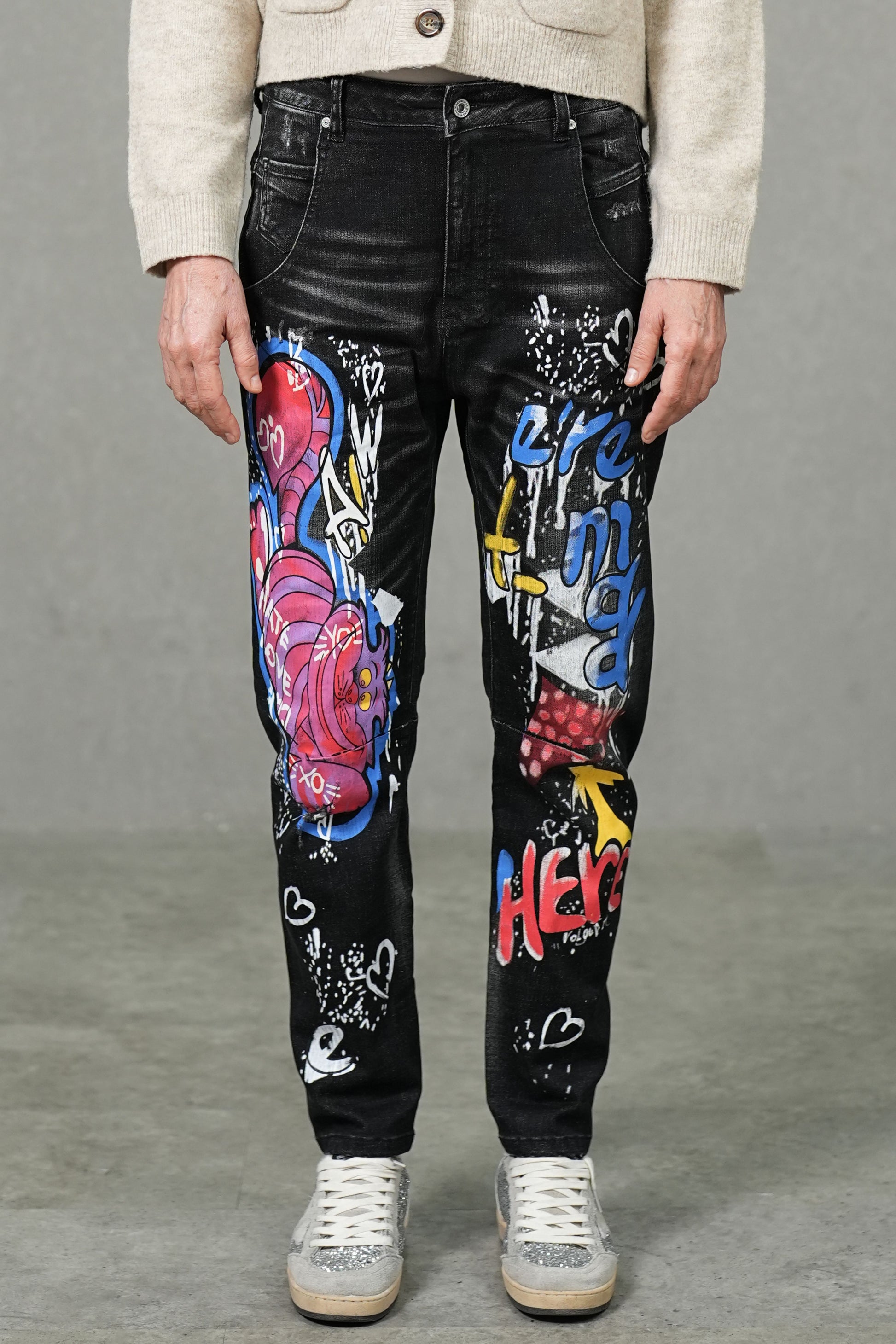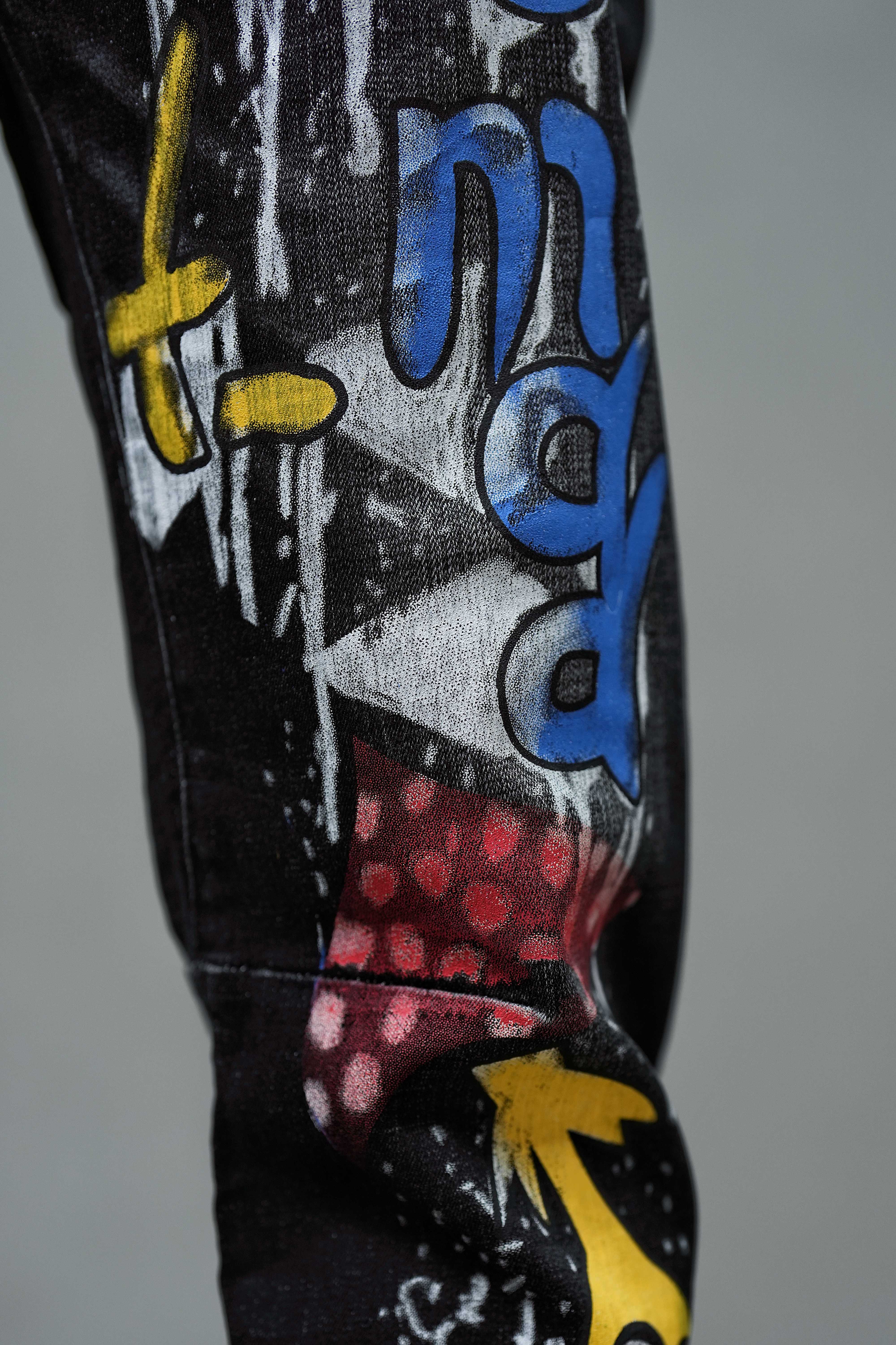 These statement jeans combine street art aesthetics with a modern slim silhouette. Crafted from mid-stretch denim, they provide flexibility and structure for everyday comfort. The bold graffiti-inspired digital print transforms classic black denim into an expressive canvas of color and creativity. A mid-rise waist and sleek slim fit ensure a flattering shape with a contemporary edge — perfect for those who dress with confidence and individuality.